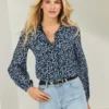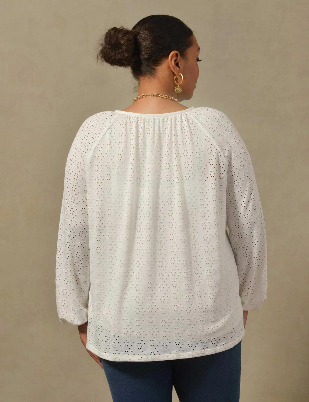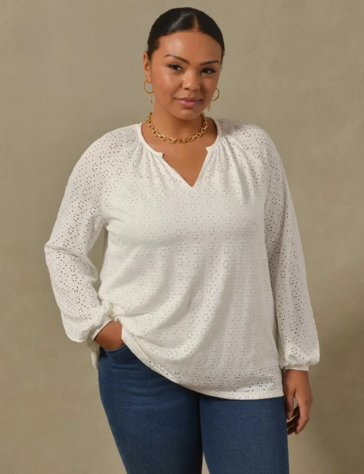 With its pretty broderie fabric, this blouse from Live Unlimited London is destined to become a summer staple. It’s cut to a relaxed fit, with a slightly A-line shape for movement through the hem. The long raglan sleeves with elasticated cuffs create feminine volume and a laid-back feel. A flattering notched v-neckline completes the look.