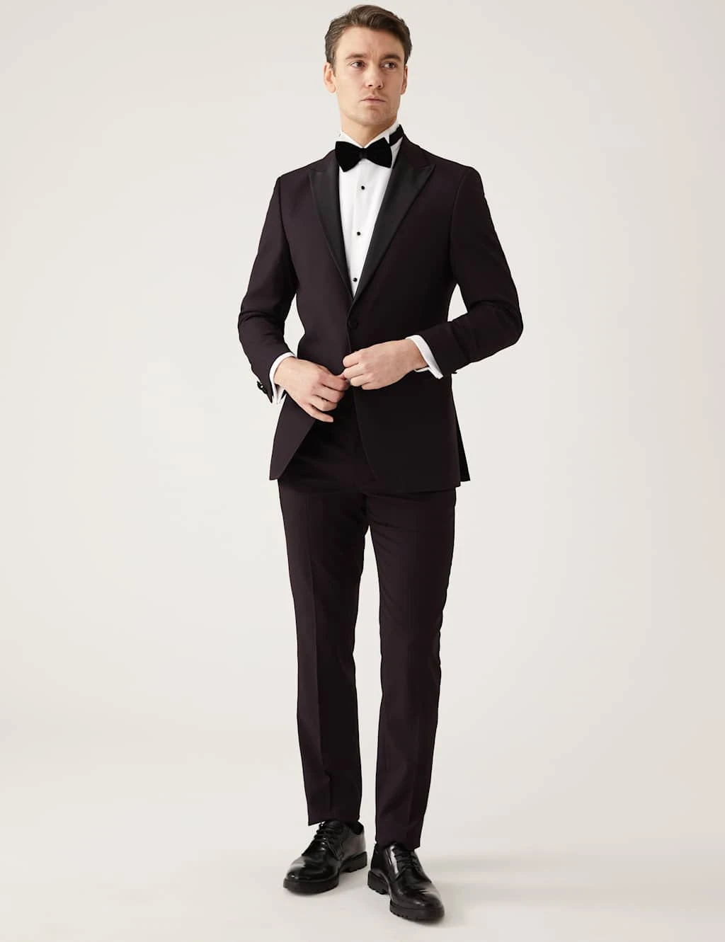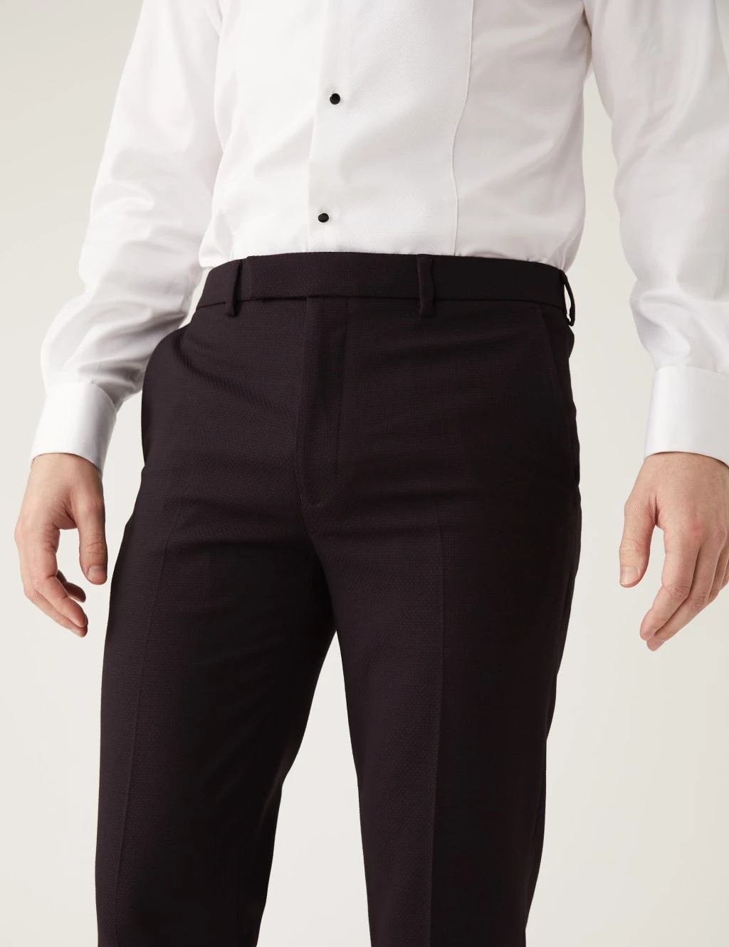 Outsmart the formal dress code with these comfortable burgundy tuxedo trousers. The slim fit design, flat front has and added stretch in the fabric to ensure it moves with you. Belt loops and side pockets provide a classic tailored finish. Perfect fo your black tie events, dinners, weddings and special occasions. M&S Collection: easy-to-wear wardrobe staples that combine classic and contemporary styles.