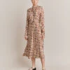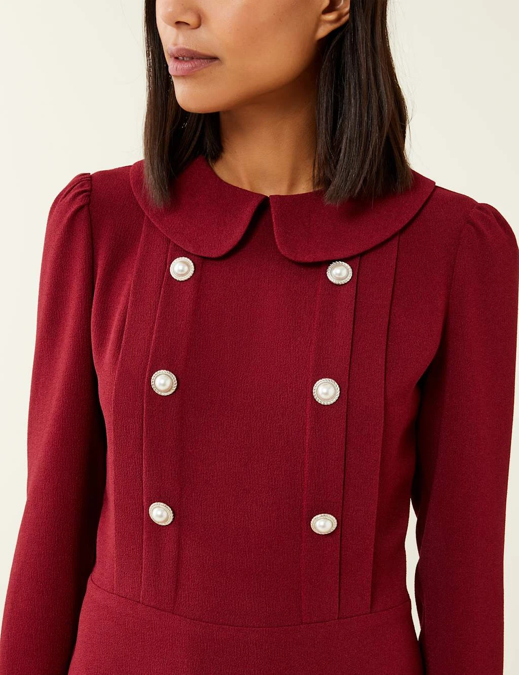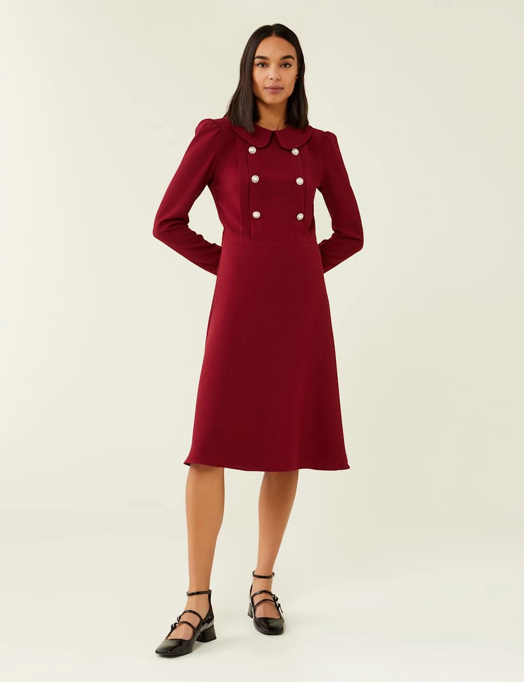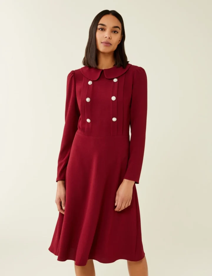 For smart events, turn to this stylish coat dress from Finery London. It’s cut in a regular fit, with a flattering waisted style and a flared midi skirt. The bodice features a Peter Pan collar and military-style button embellishments. The slightly puffed long sleeves add a softer touch to the design.