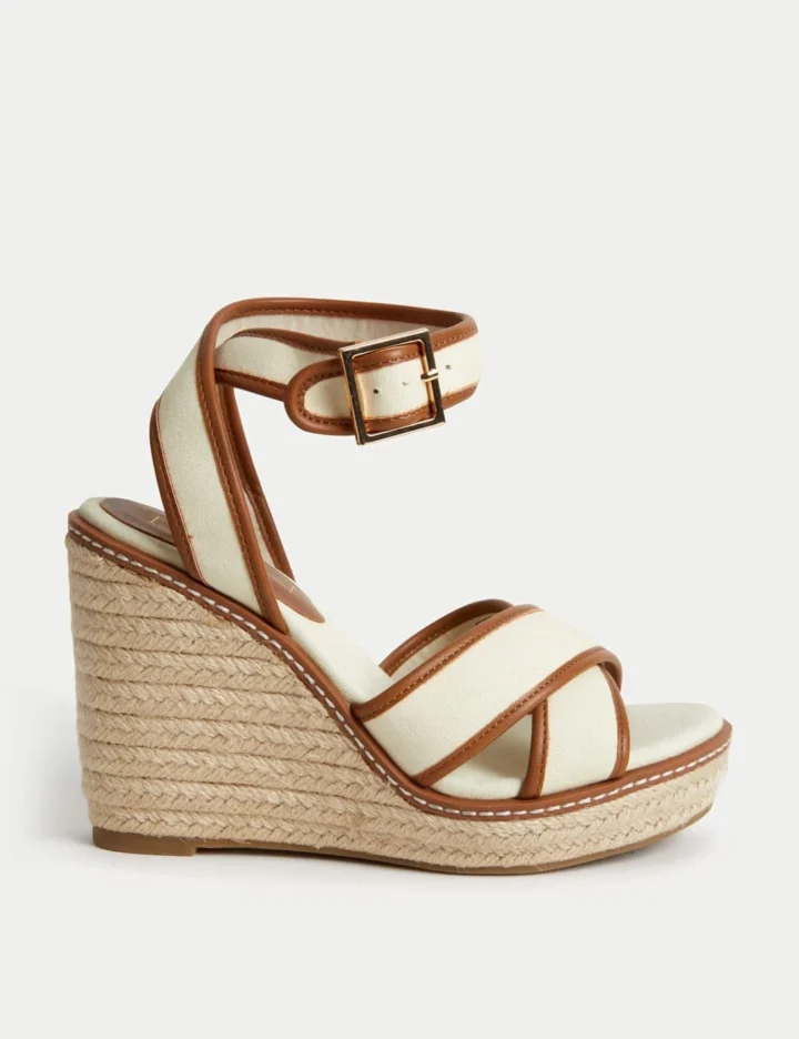 With their stylish crossover design, these sandals make an elegant addition to any outfit. Open toe espadrille style, with a high wedge heel finished with raffia trimming. Contrast bindings give smart detail, while a buckled strap at the ankle provides an elegant finish.