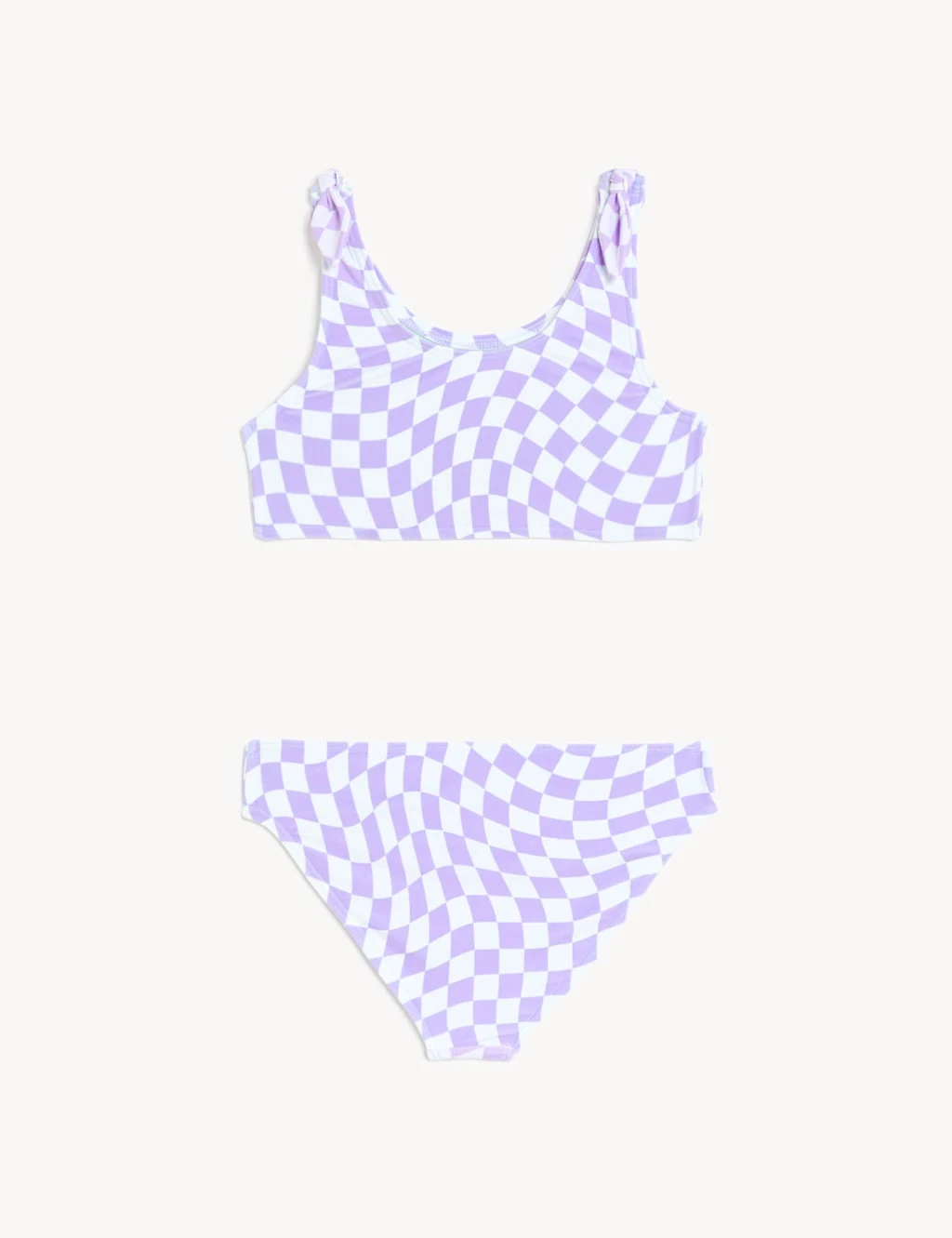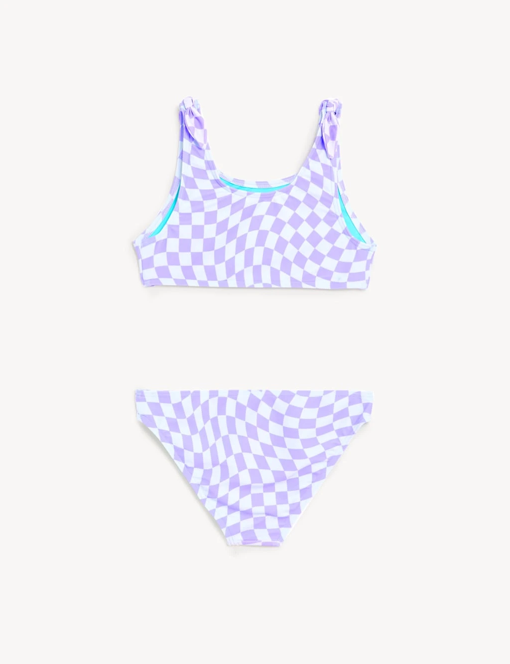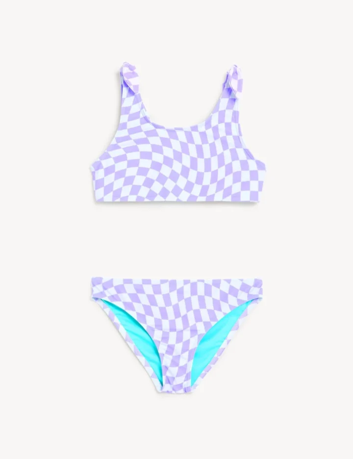 This checkerboard bikini is perfect for sea adventures and pool days. Top has a scoop neck and tie detailing on the straps. Fabric is chlorine-resistant for longer-lasting wear and features UPF 50+ Sun Smart technology to help protect their skin. Endorsed by the British Skin Foundation.
