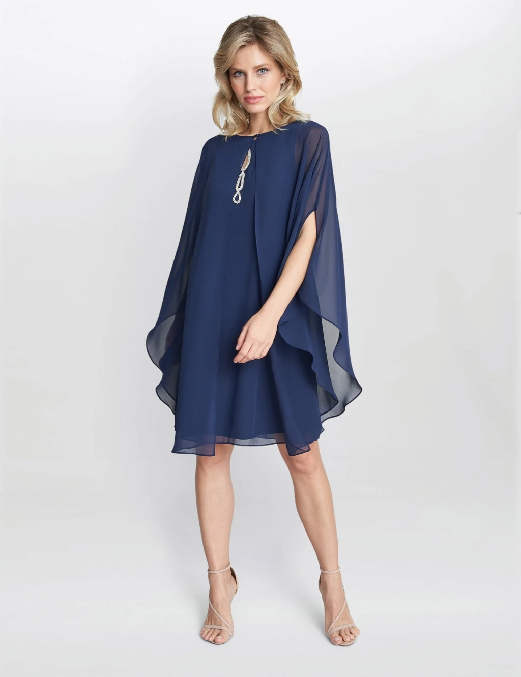 This chiffon shift dress from Gina Bacconi comes with a short-sleeved cape that creates a flowing, fluttery silhouette. It’s cut in a comfy regular fit, with a sleeveless bodice that’s ideal for warmer weather. The round neckline has a flirty keyhole detail embellished with glittering beadwork, while the hemline finishes at a wear-anywhere knee length.