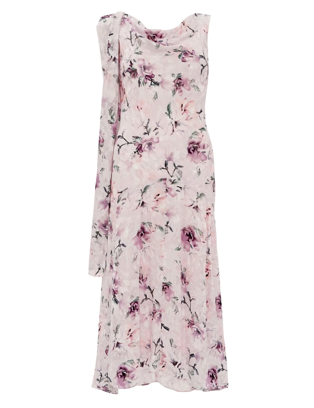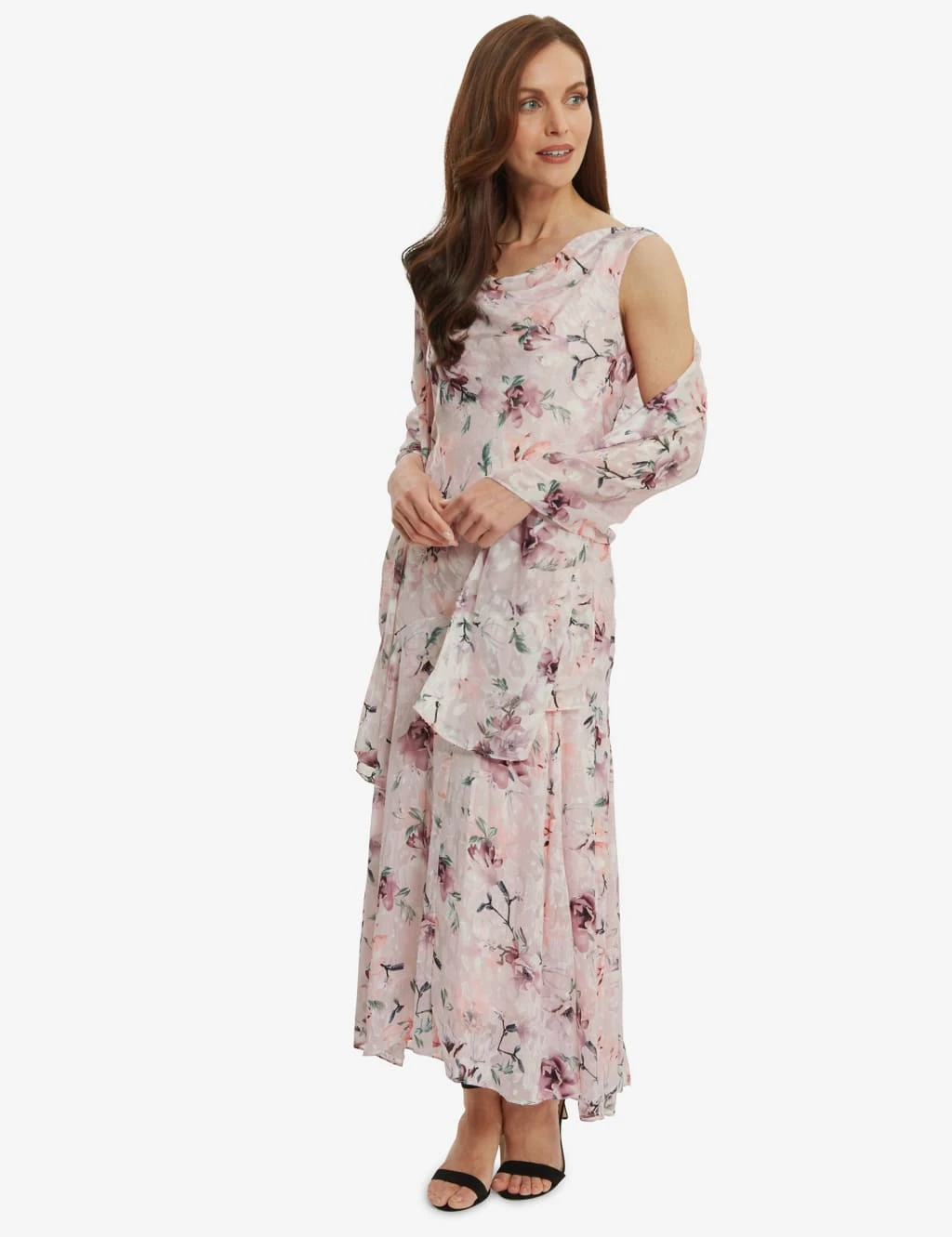 This sleeveless floral shift dress by Gina Bacconi is an elegant choice for special occasions. Crafted from delicate chiffon fabric, it’s designed in a regular fit with a flattering cowl neckline. The soft, pleated skirt falls to a flattering midi length. A matching shawl offers elegant coverage.