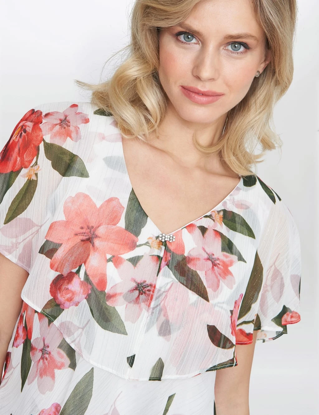 This occasion-ready shift dress by Gina Bacconi is crafted from layers of floral print chiffon to create a soft, floaty silhouette. It’s cut in a regular fit with a v-neckline accentuated by diamanté detailing. Short caped sleeves bring delicate movement, while the tiered skirt falls to an elegant knee length.