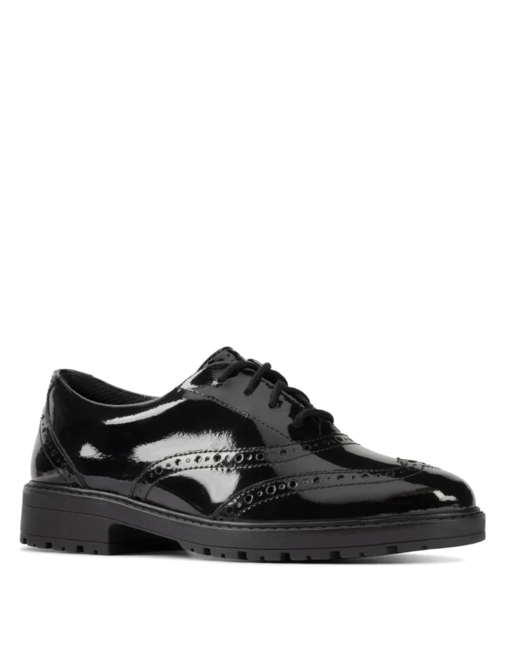 Add a touch of extra shine to their day with these patent lace-up brogues from Clarks. A padded collar and eco foam footbed offer supreme comfort and support. The premium leather upper has punched detailing for a traditional touch and sits on a chunky rubber sole.