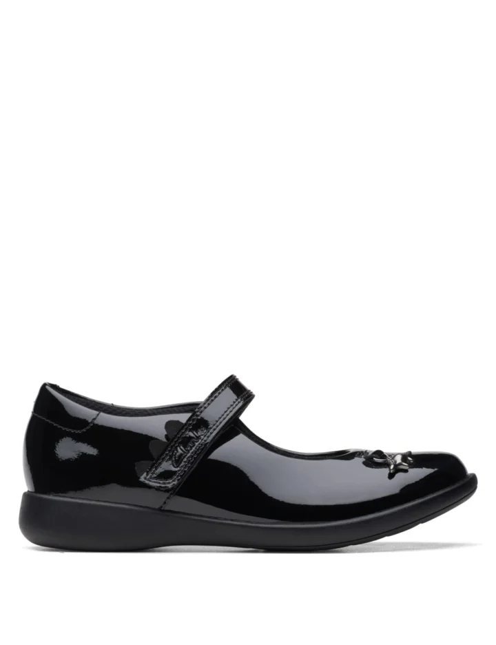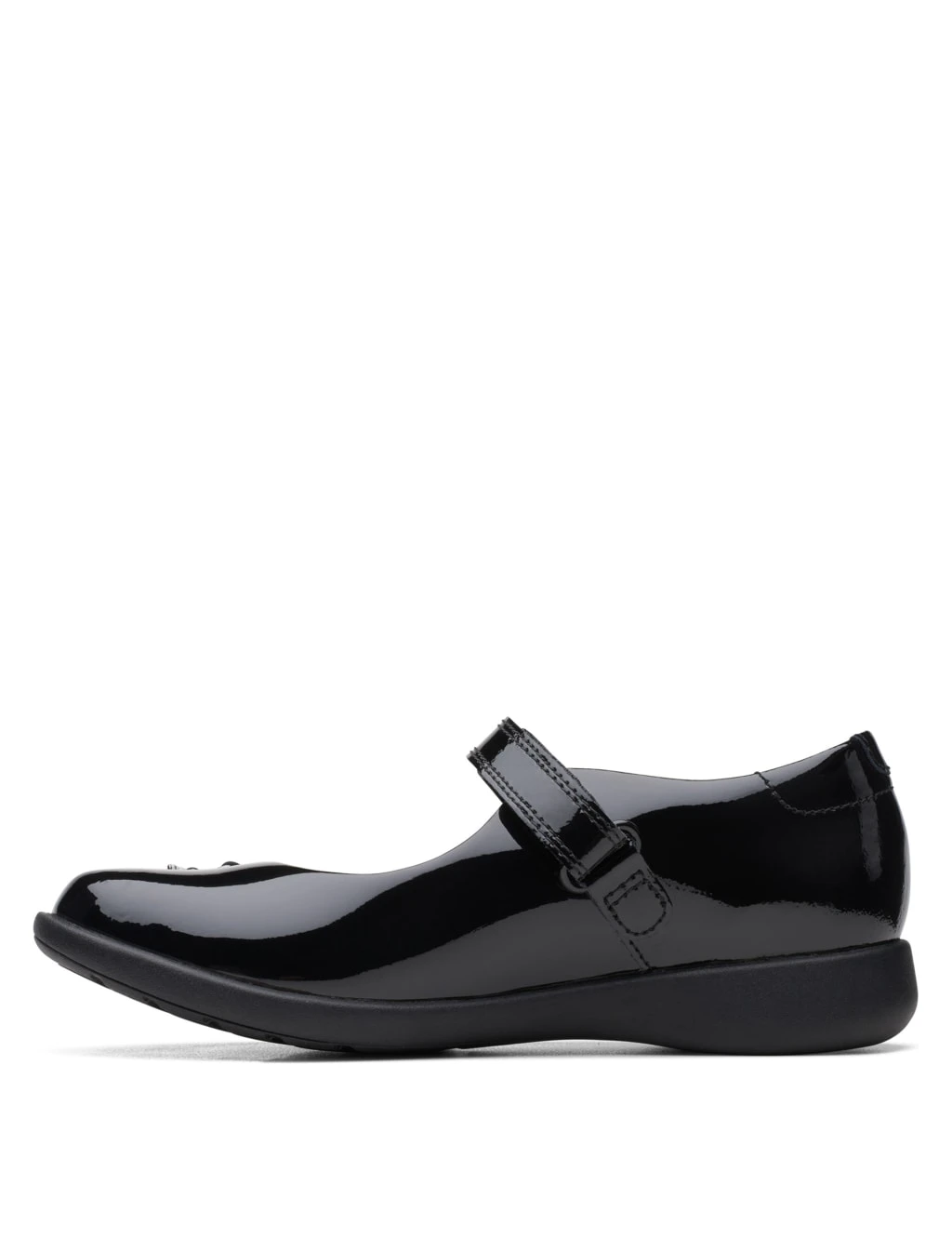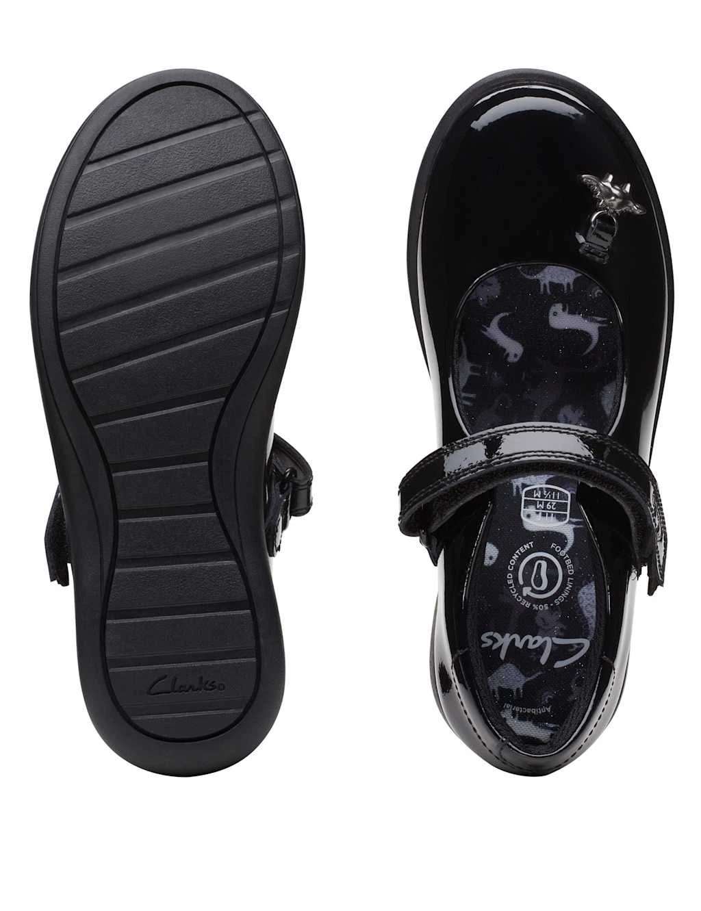 These shiny Mary Jane shoes from Clarks mean they can still show off their love for dinosaurs at school. They come in a comfortable standard fit, with riptape straps for quick and easy dressing. A dinosaur charm on the front and a print on the undersole add a fun finish to these sturdy everyday shoes.