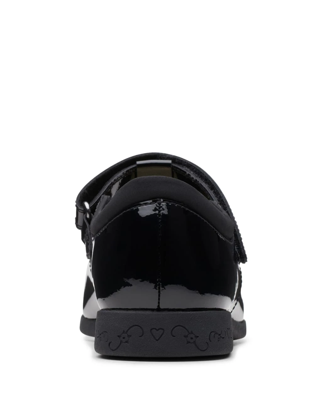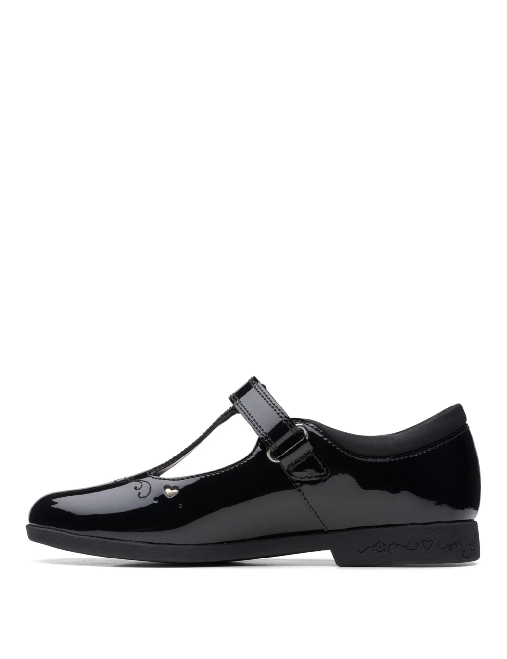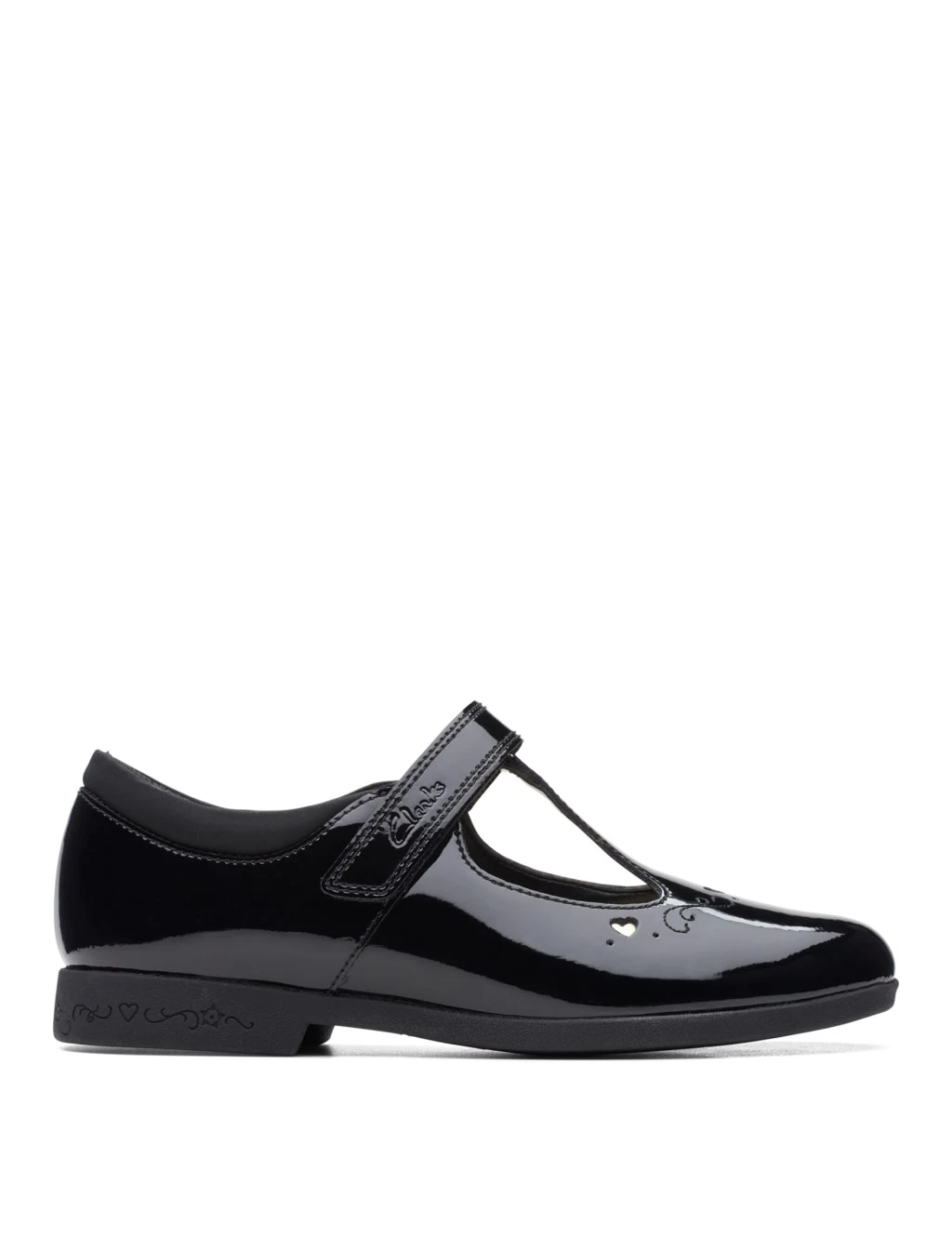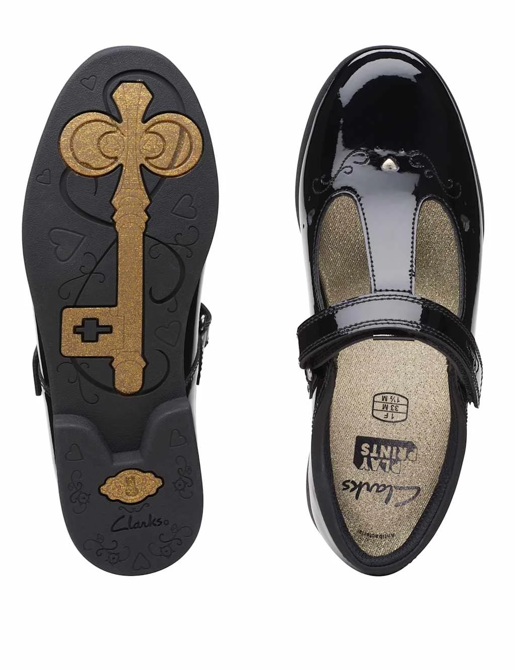 Add some magic to their school uniforms with these shiny shoes from Clarks. These classic Mary Janes keep feet comfortable with their standard fit and feature riptape fastenings for easy on-off. Cut-out hearts and embroidery detailing enhance the premium feel. A golden key design on the undersole adds to the unique look.