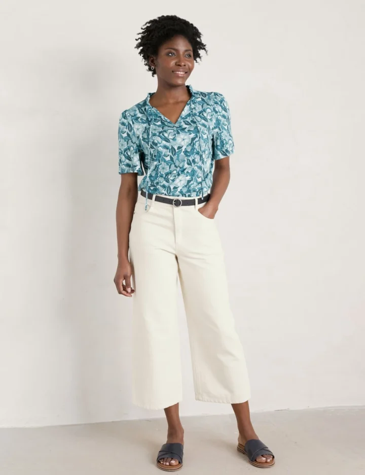 Crafted from organic cotton-blend jersey, this floral top from Seasalt Cornwall is perfect for warmer weather. The short-sleeved style is designed in an easy regular fit. A pretty frill trim and a delicate tie fastening at the neck add a feminine feel.