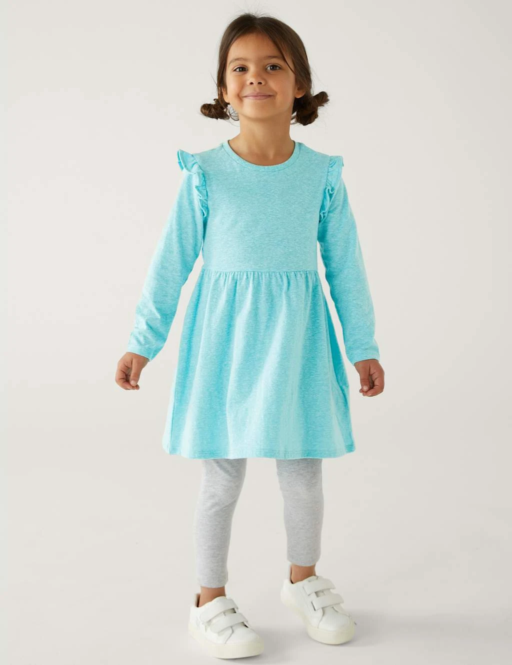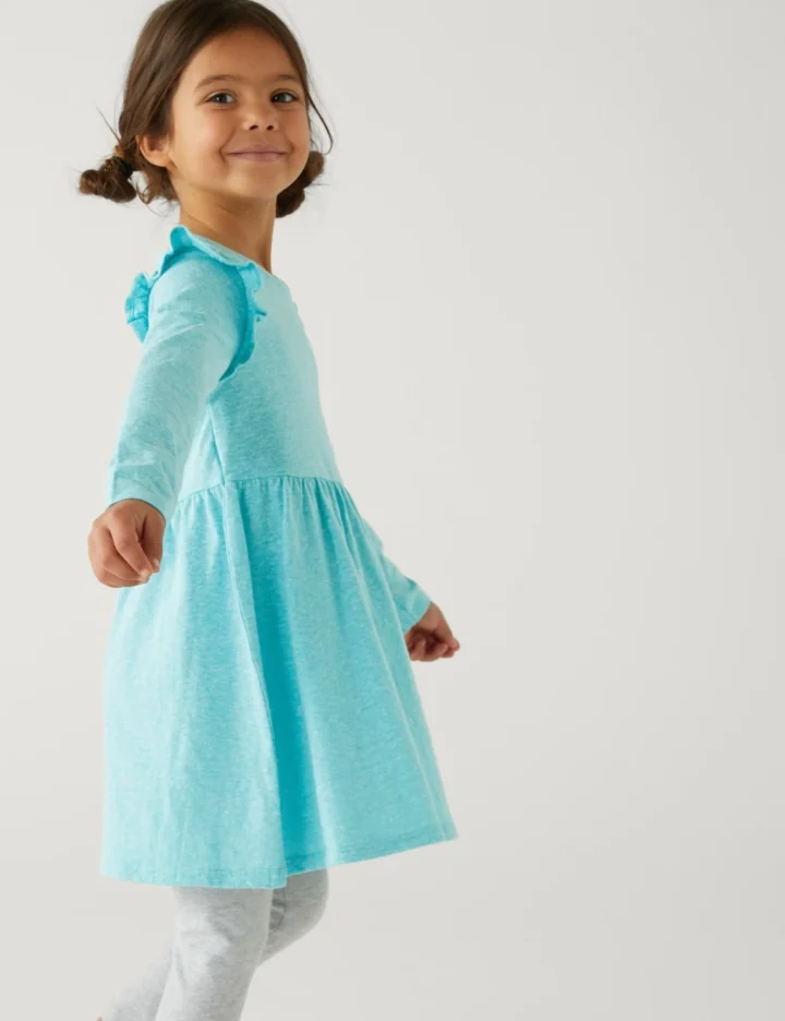 This cotton-blend dress is a go-to for everyday wear. Designed in a regular fit, it has warm long sleeves and a comfy round neck. Frill details on the shoulders give a pretty twist. We only ever use responsibly sourced cotton for our clothes.