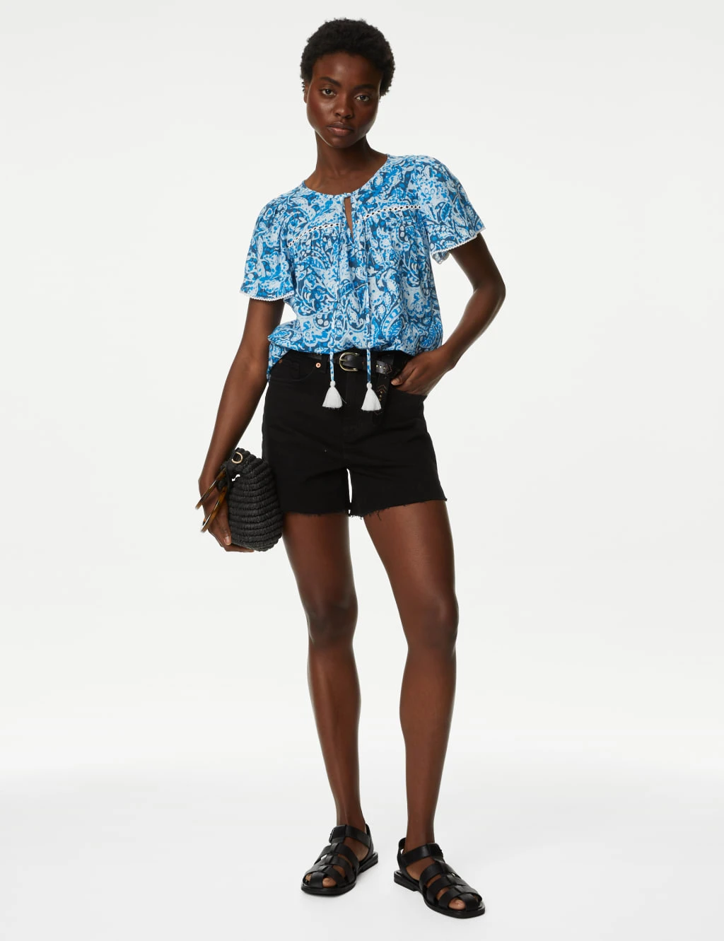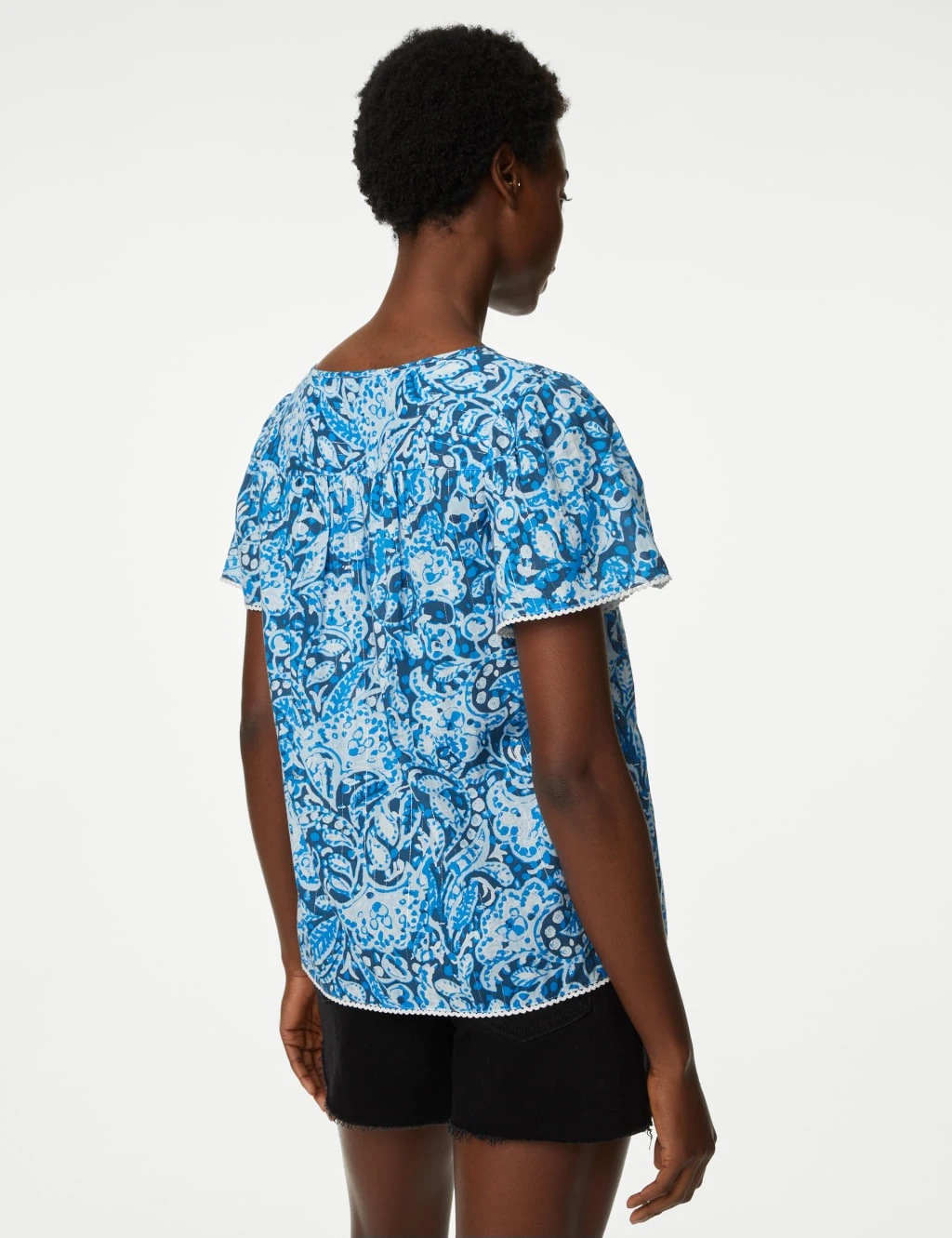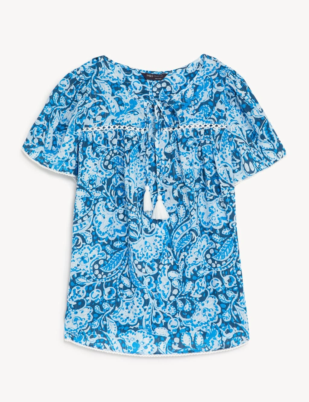 It’s the little details on this printed, cotton-blend blouse that make it such a gorgeous style for sunny days. Regular fit, with a round neck and short angel sleeves. A delicate tie at the neckline is finished with stylish tassels for a boho touch. Complete with shimmery metallic threading and a ladder lace trim on the smocked bodice for added charm.