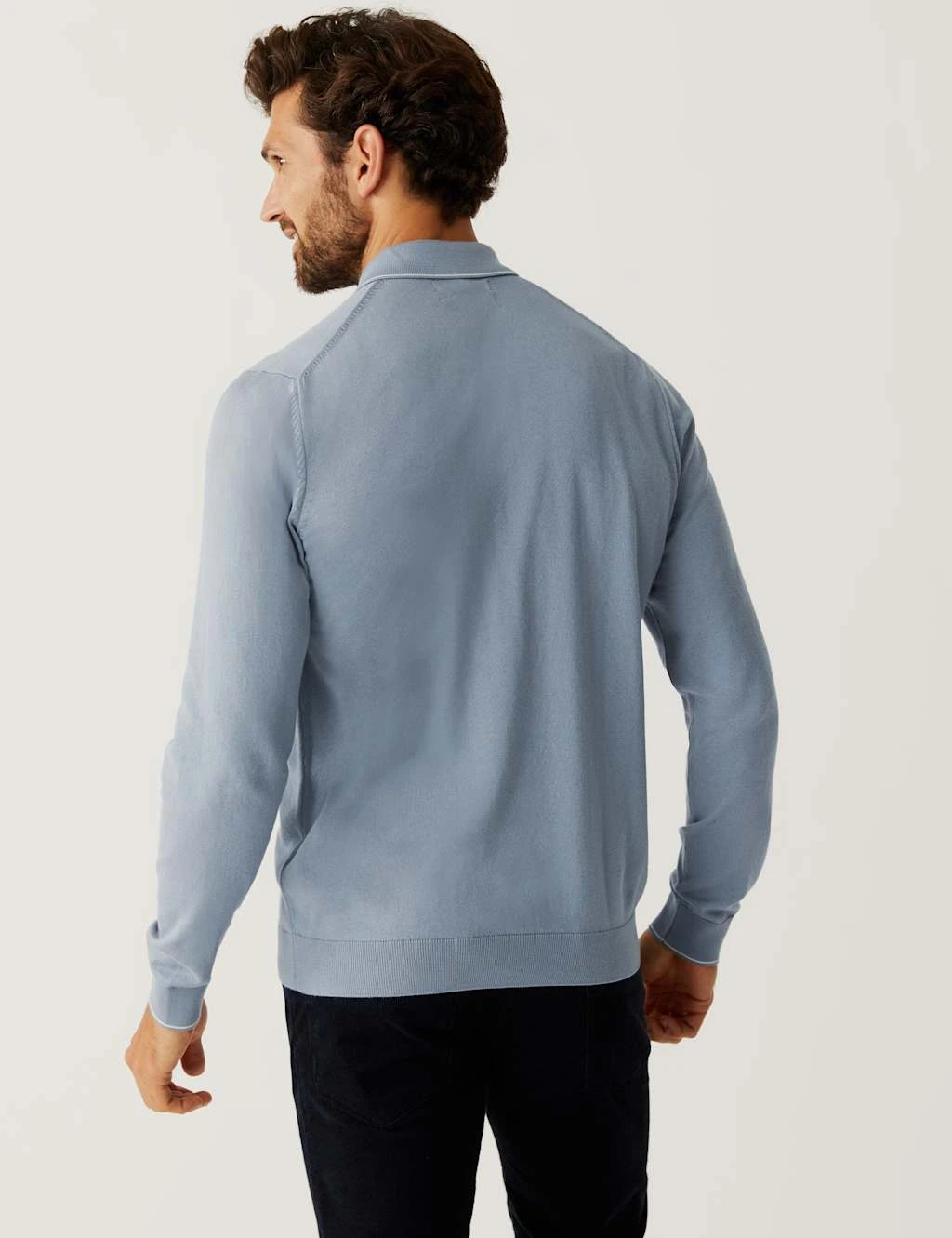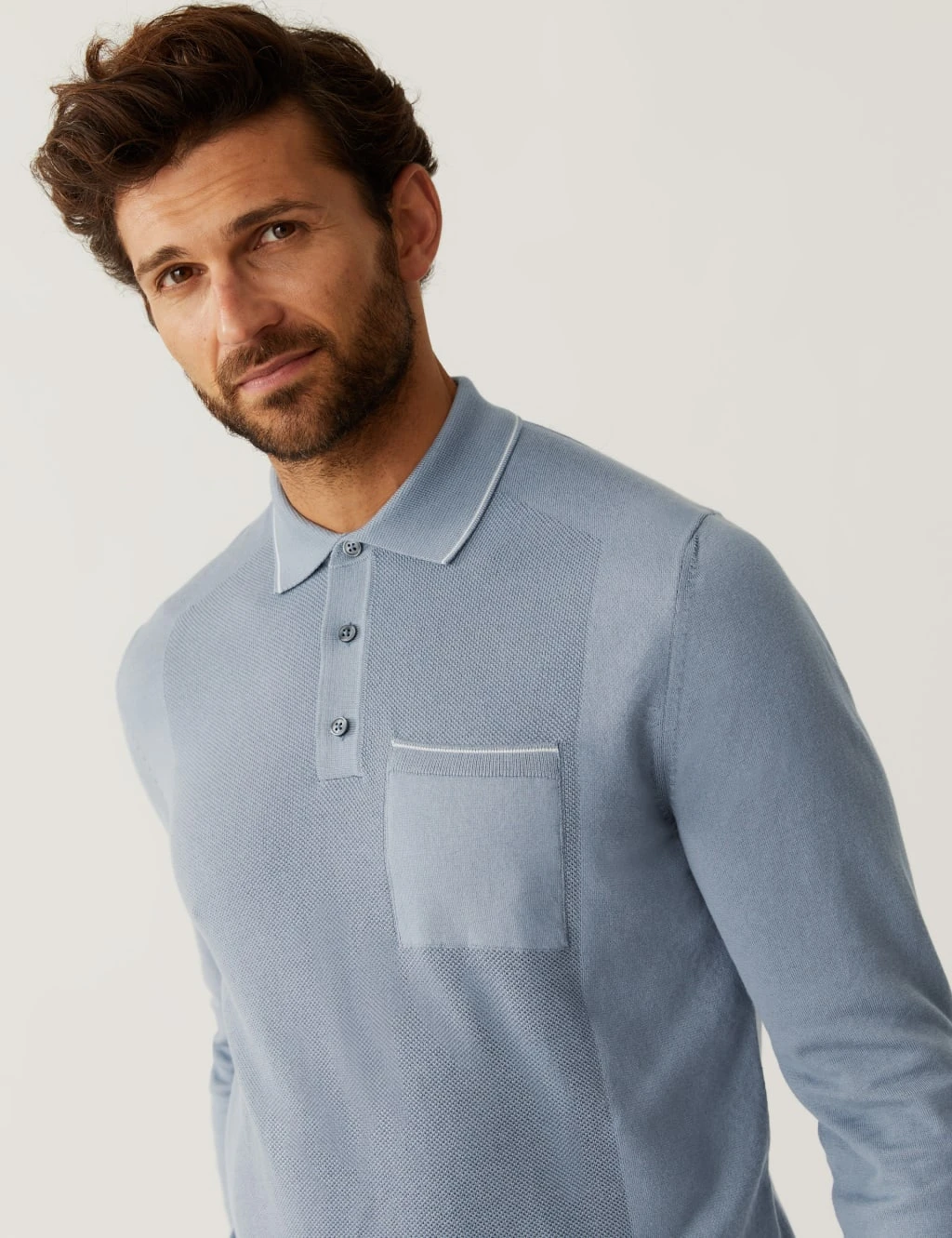This cotton-blend knitted polo shirt will make a stylish addition to your casual wardrobe. It’s cut to a comfy regular fit with a long sleeves and a buttoned, collared neck. A textured panel covers the front for a striking look, and there’s a handy chest pocket too. The pocket, hem and cuffs all feature a ribbed trim.