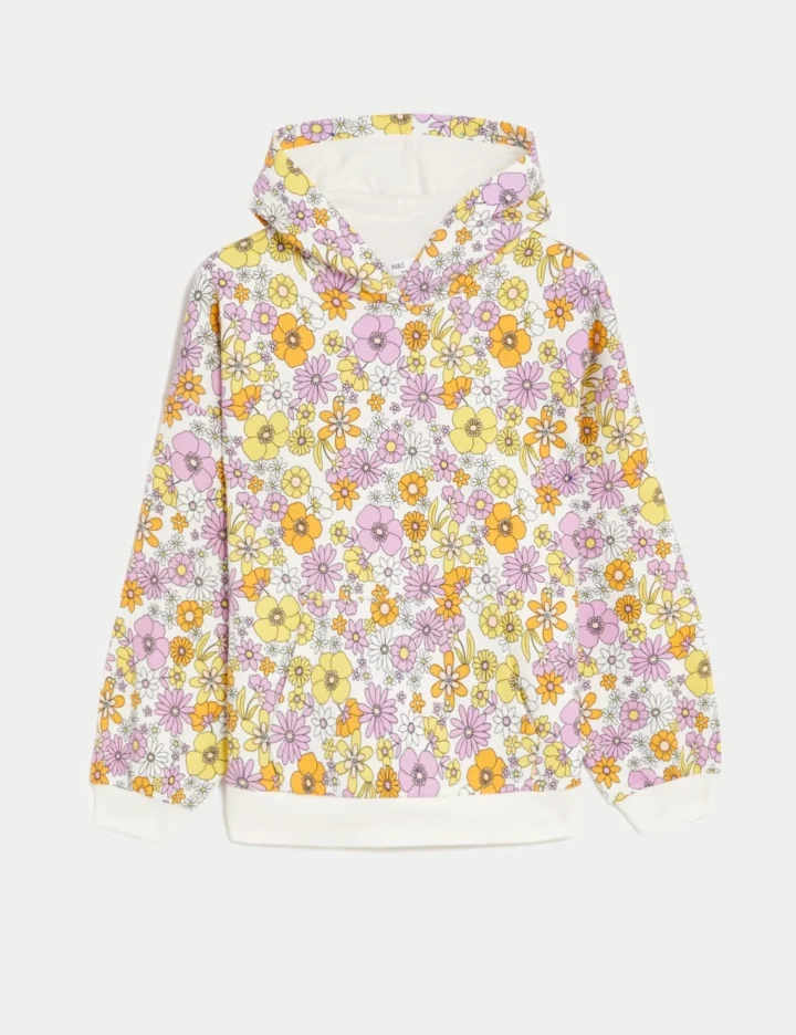Freshen up their wardrobe with this bright cotton-rich hoodie. Comfy regular fit. The colourful floral pattern adds plenty of cheer. Contrast ribbing at the cuffs and hem lends a cosy finishing touch.