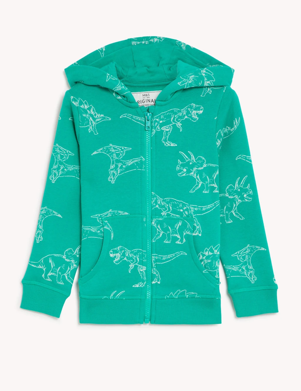 Fearsome dinos stomp across this printed cotton-rich hoodie. It’s cut to a regular fit, with a zip-through fastening and a comfy lined hood. Finished with ribbed cuffs and hems and classic front pockets.
