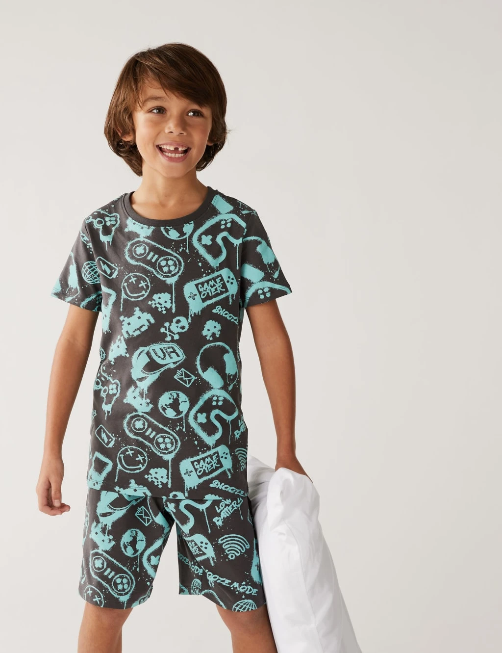 When it’s time to switch off, young gamers can get ready for bed with these cool cotton-rich pyjamas. Skinny fit with added stretch for comfort. Set comprises t-shirt and matching shorts in an all-over gaming-inspired print. We only ever use responsibly sourced cotton for our clothes.
