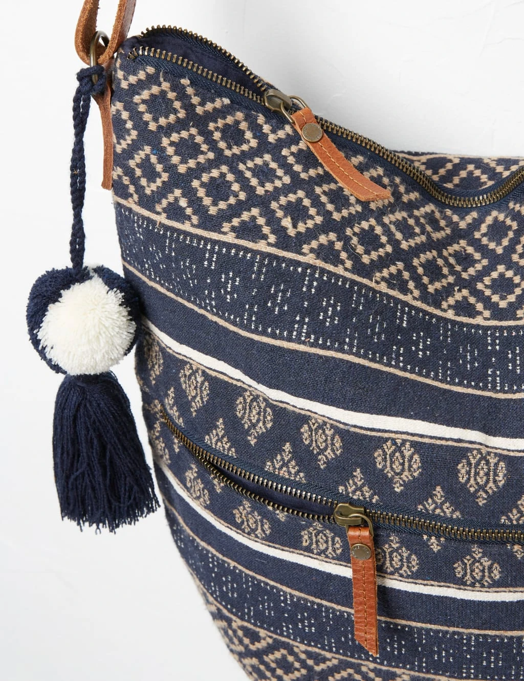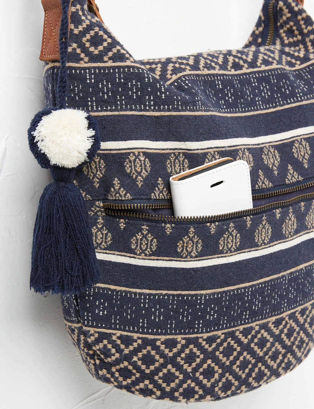This cotton-rich tote bag from FatFace has a playful geometric print, making it a fun choice for easy-breezy days. The central compartment has a secure zip fastening. Plus, there’s an extra zipped pocket on the outside to store smaller items. An adjustable strap lets you wear your new bag your way. On one side, a pom pom tassel gives a quirky finishing touch.