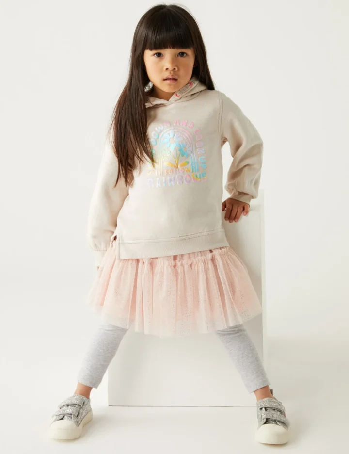 Add some subtle shimmer to their wardrobe with this cotton-rich hoodie. Comfy regular fit, with ribbed trims on the cuff and hem. Glitter-embossed print features flowers and the slogan ‘Slow Down And Look Up – Follow Rainbows’ for a dose of positivity. We only ever use responsibly sourced cotton for our clothes.