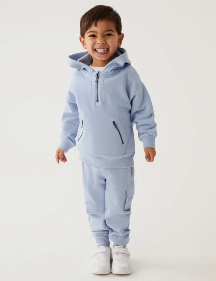 This cotton-rich outfit is an easy and stylish option for relaxed weekends. Regular fit set includes a half-zip hoodie with a handy zipped kangaroo pocket. The joggers feature a comfy drawstring waistband as well as two side pockets and a cool cargo-style pocket on the leg.