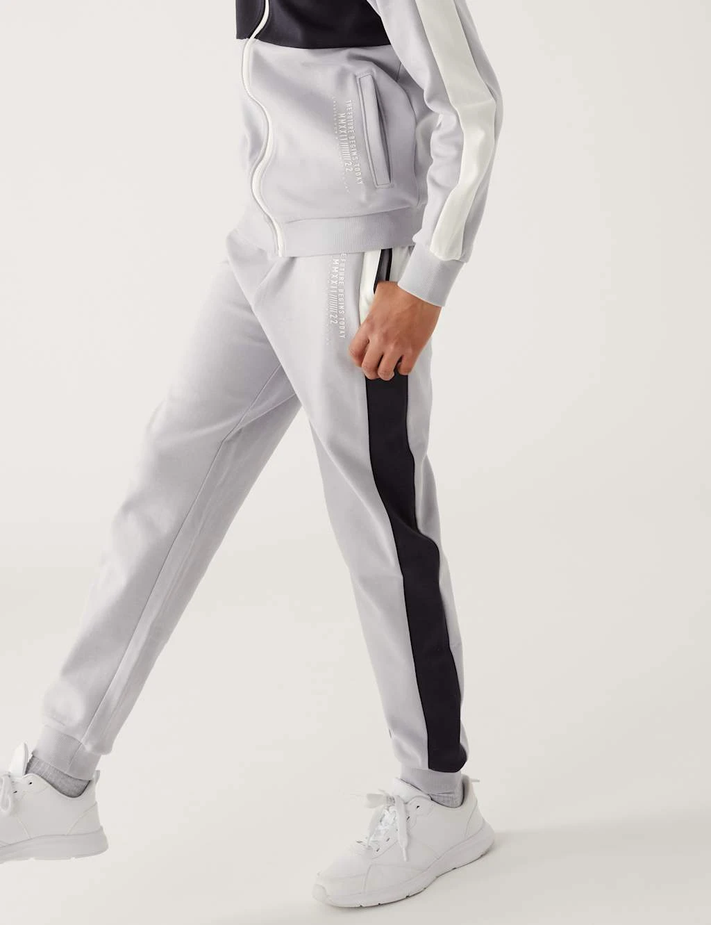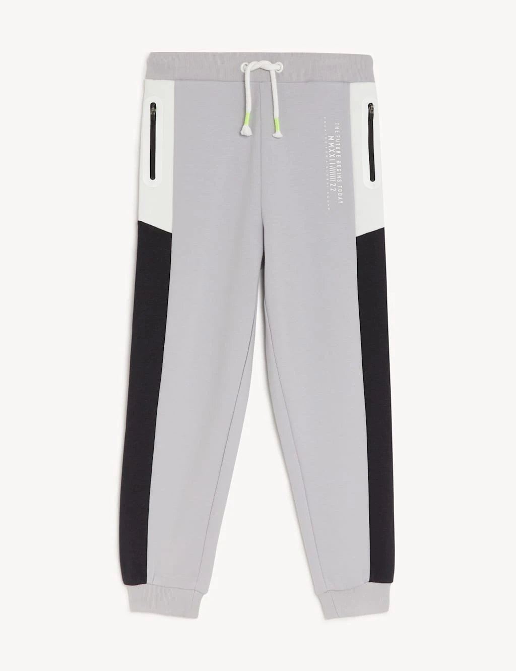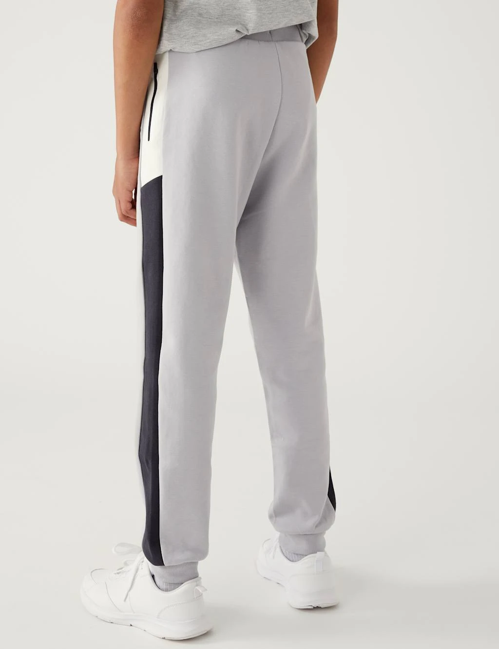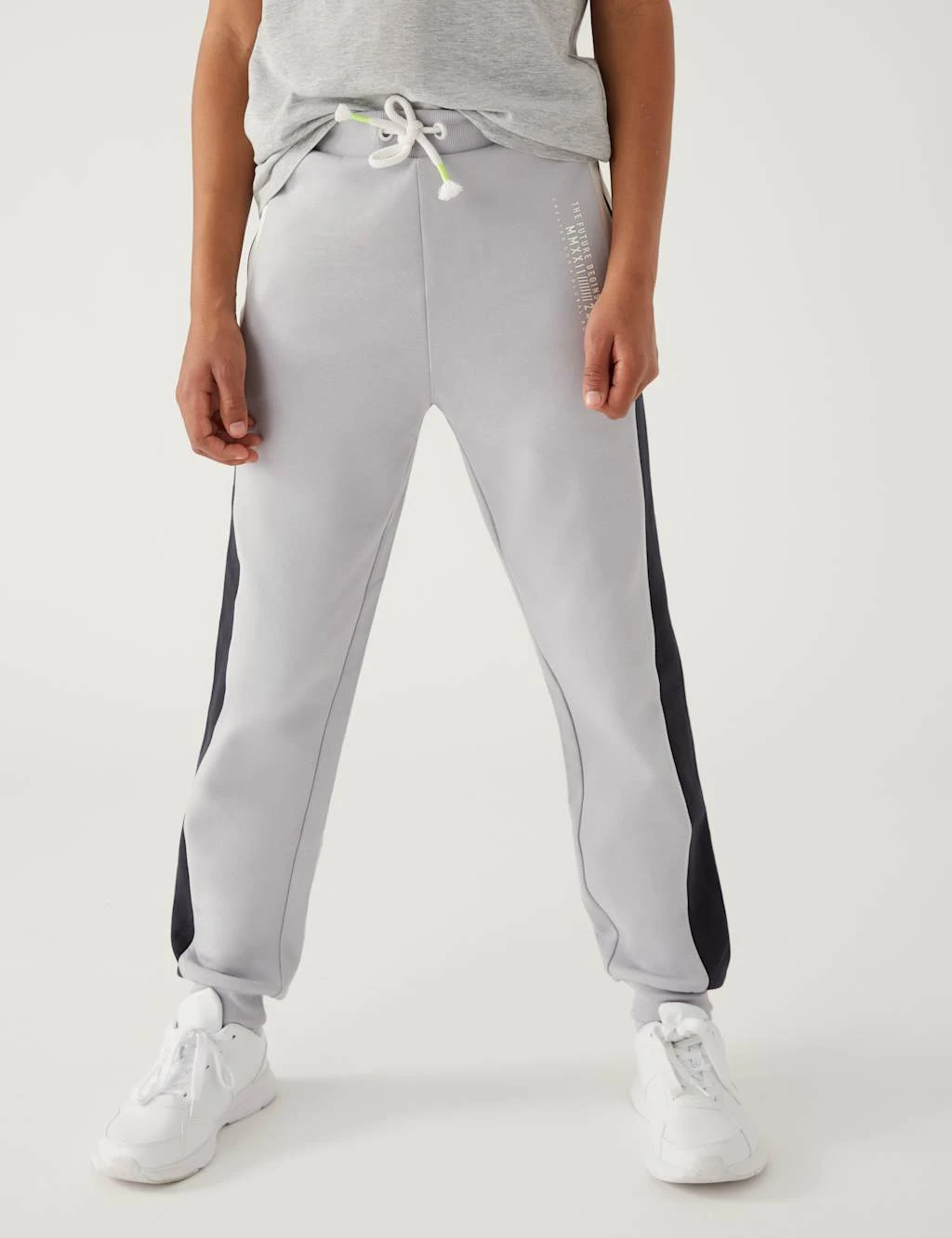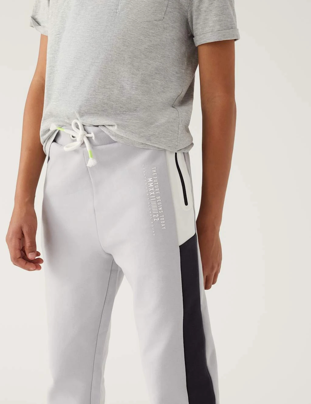 With their substantial cotton-rich fabric, these joggers are ideal for active youngsters. Comfy regular fit, with a drawstring tie at the waist. Side panels give a sporty air, while textured letter-printing on the leg adds a cool touch. The vertical pockets have zips to keep their stuff secure.