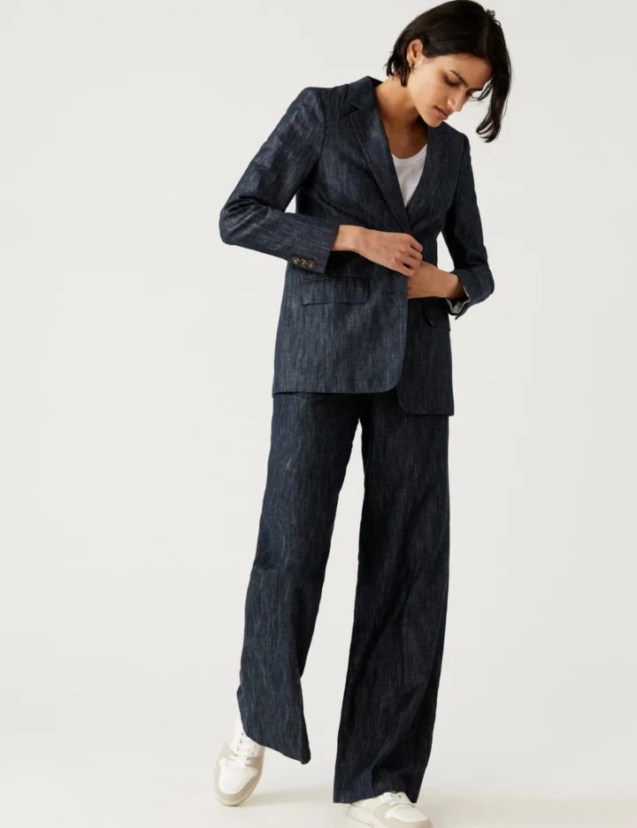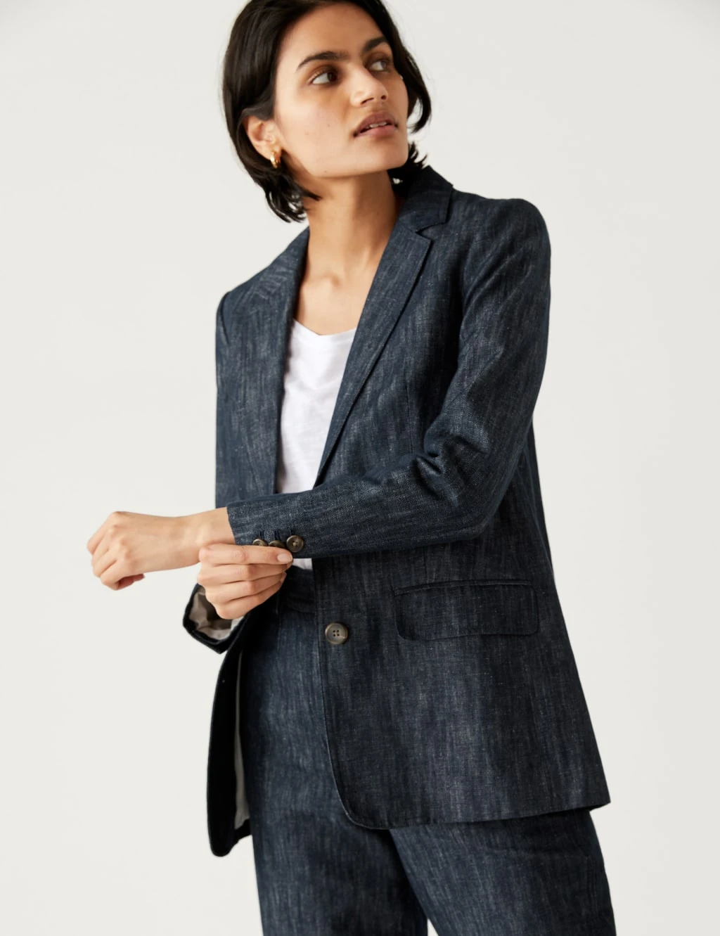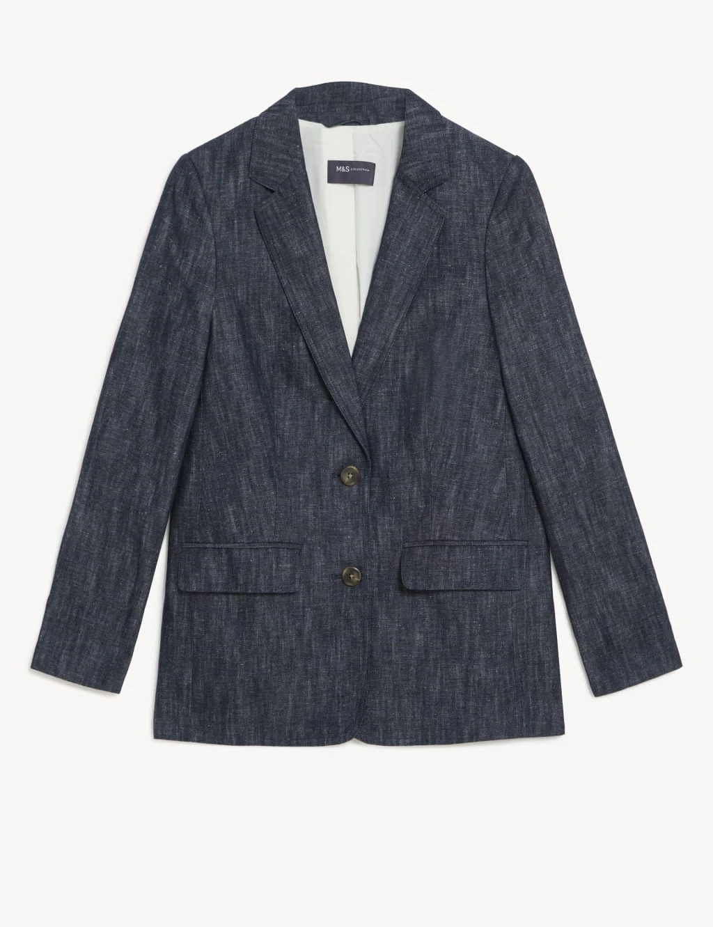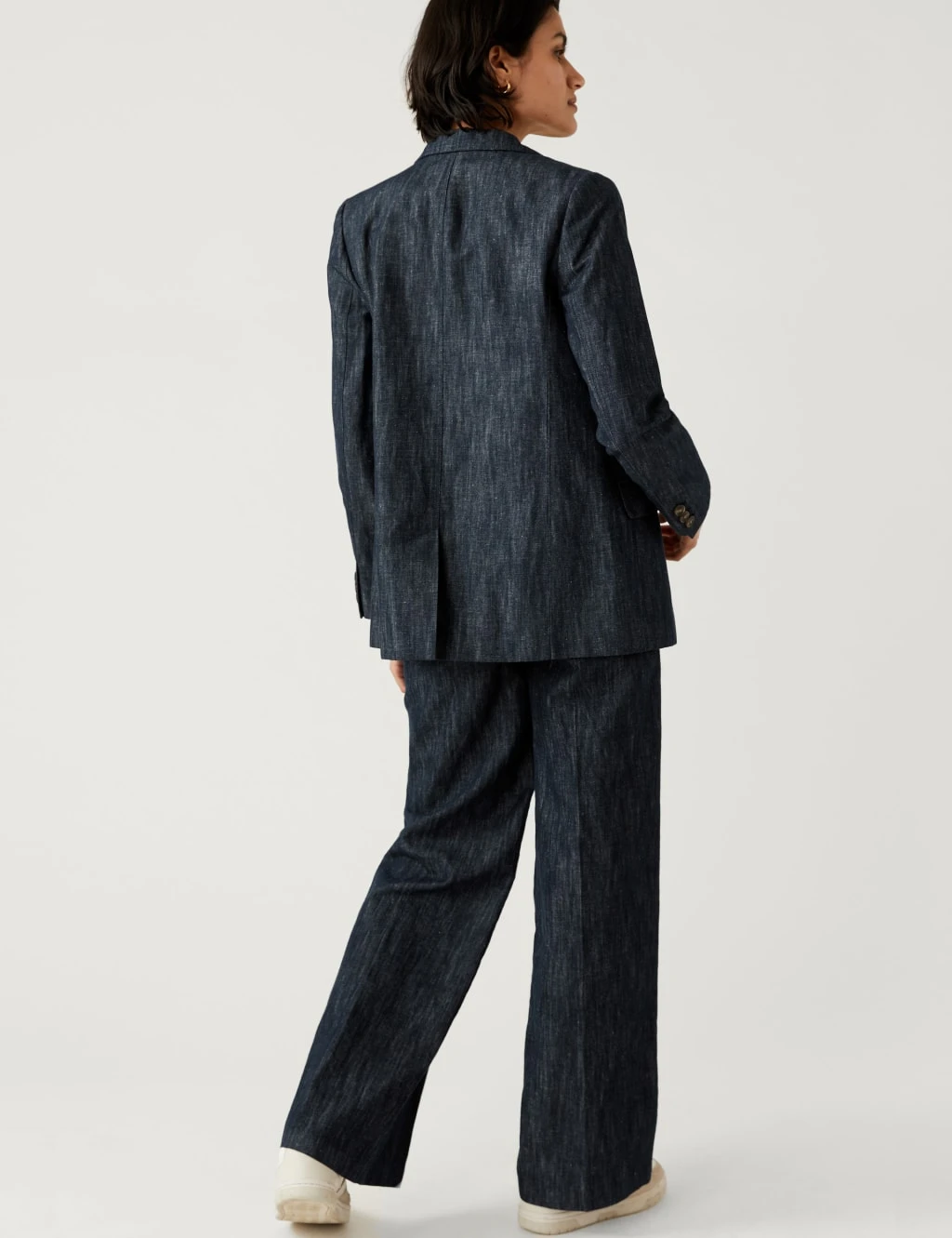 Our cotton-linen blazer is the perfect blend of smart and casual, with its denim-effect finish and classic tailoring touches. The roomy, relaxed fit piece features traditional notch lapels, working cuffs and flap pockets, which contrast stylishly with the easy-wearing fabric. Matching trousers are available.