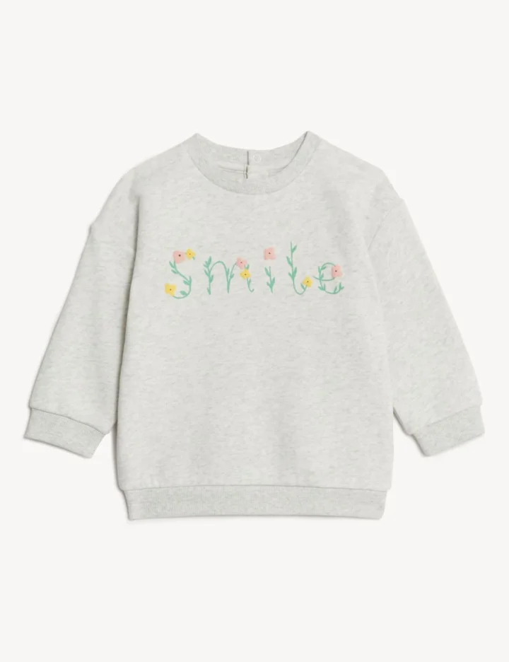 Make them smile with this cotton-rich sweater. Popper fastenings make changing time quicker and easier. A ‘Smile’ slogan and charming flowers adorn the front. We only ever use responsibly sourced cotton for our clothes.