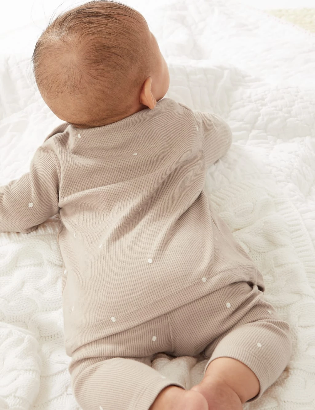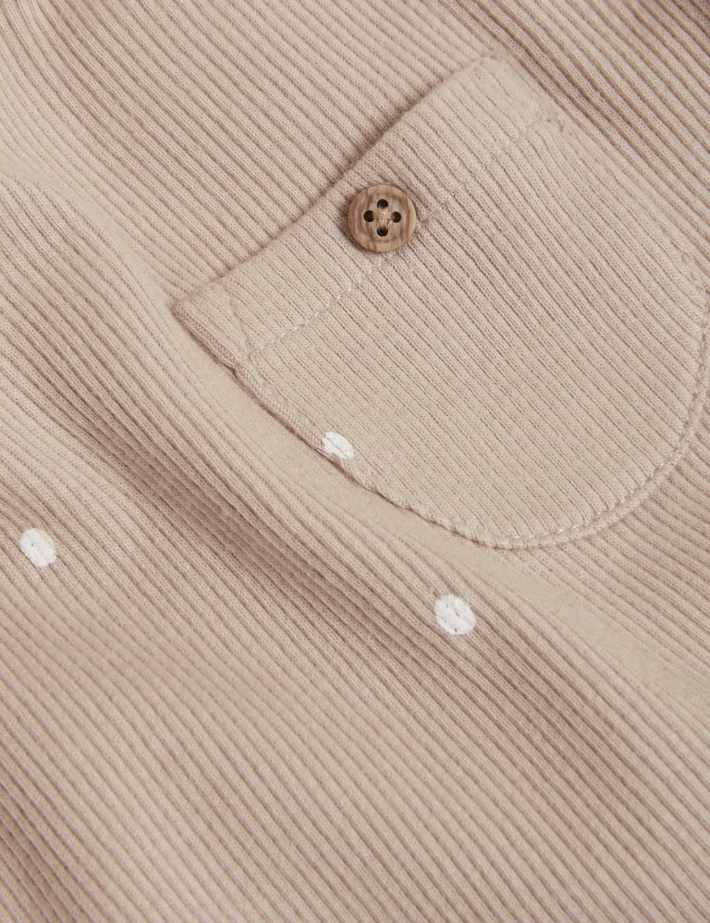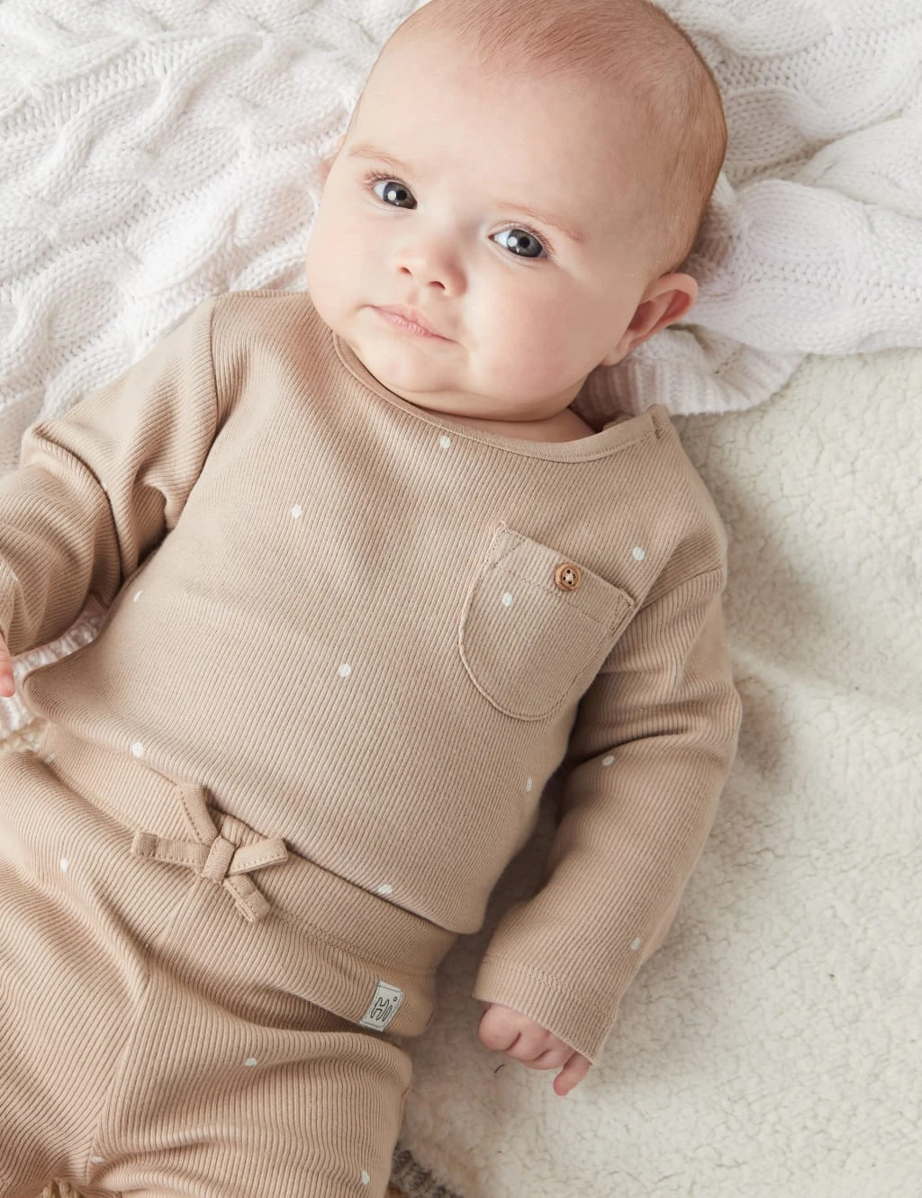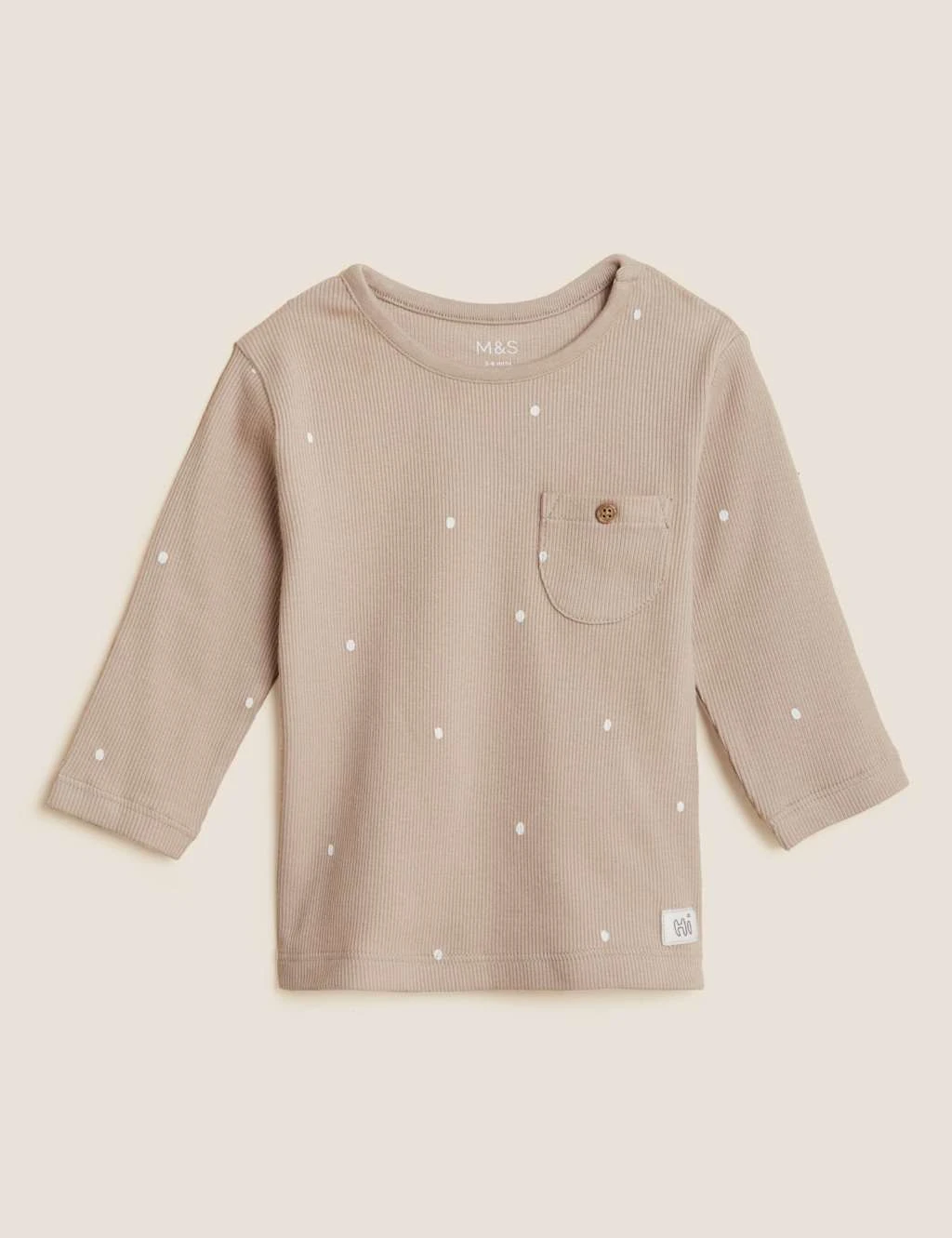Refresh baby’s everyday essentials with this cotton-rich top. This spot-print style is crafted from ribbed fabric with added stretch for a comfy fit. A concealed popper fastening at the shoulder makes dressing quick and easy. It’s finished with a mockwood button pocket, plus a small tab on the hem with a ‘Hi’ slogan. We only ever use responsibly sourced cotton for our clothes.