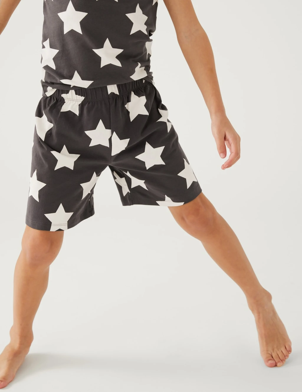 Send your little star off to bed in this cotton-rich pyjama set. It’s cut to a snug skinny fit with a t-shirt and shorts. Added stretch in the fabric for comfort. Plus, the shorts have a stretchy elasticated waist so won’t dig in.