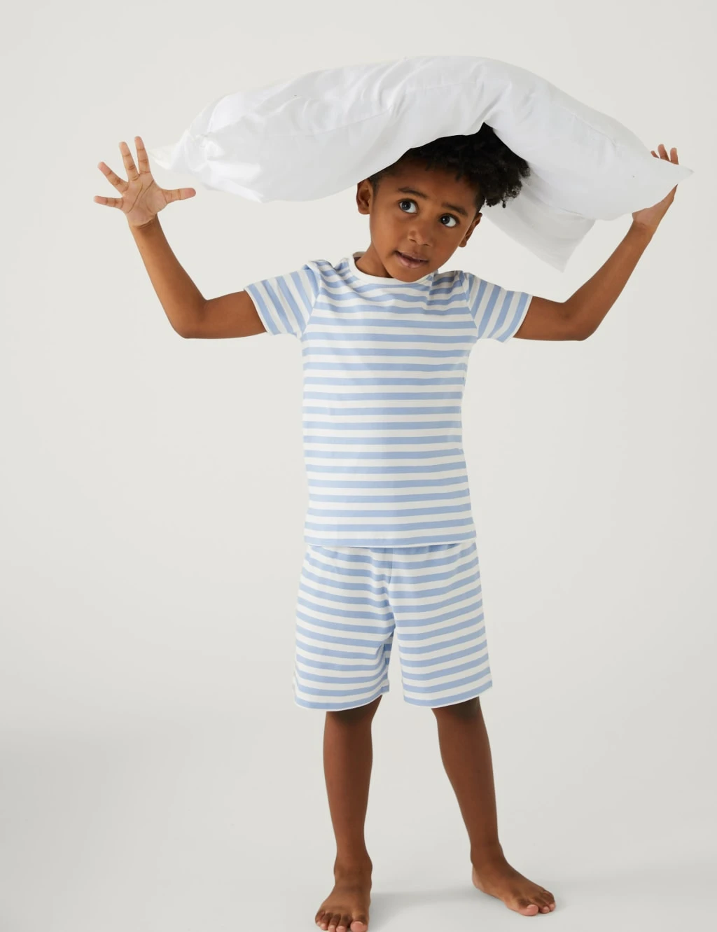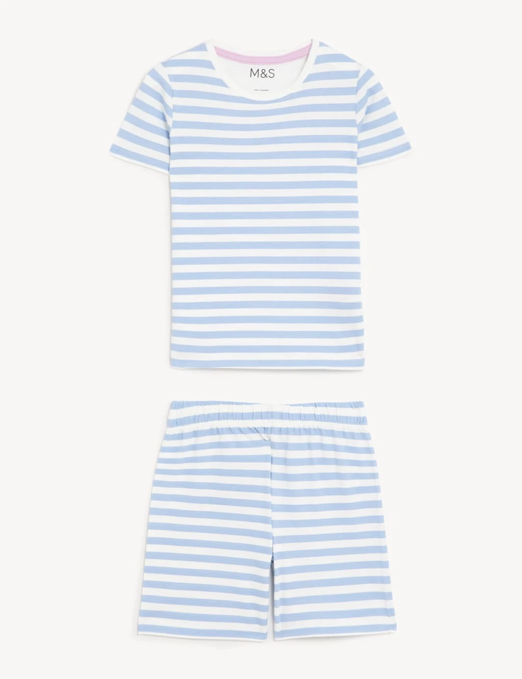 Refresh their nightwear collection with these cotton-rich pyjamas in a classic striped design. Made in a cool skinny fit with added stretch for comfort. The set includes a t-shirt and a pair of shorts with an elasticated waist.