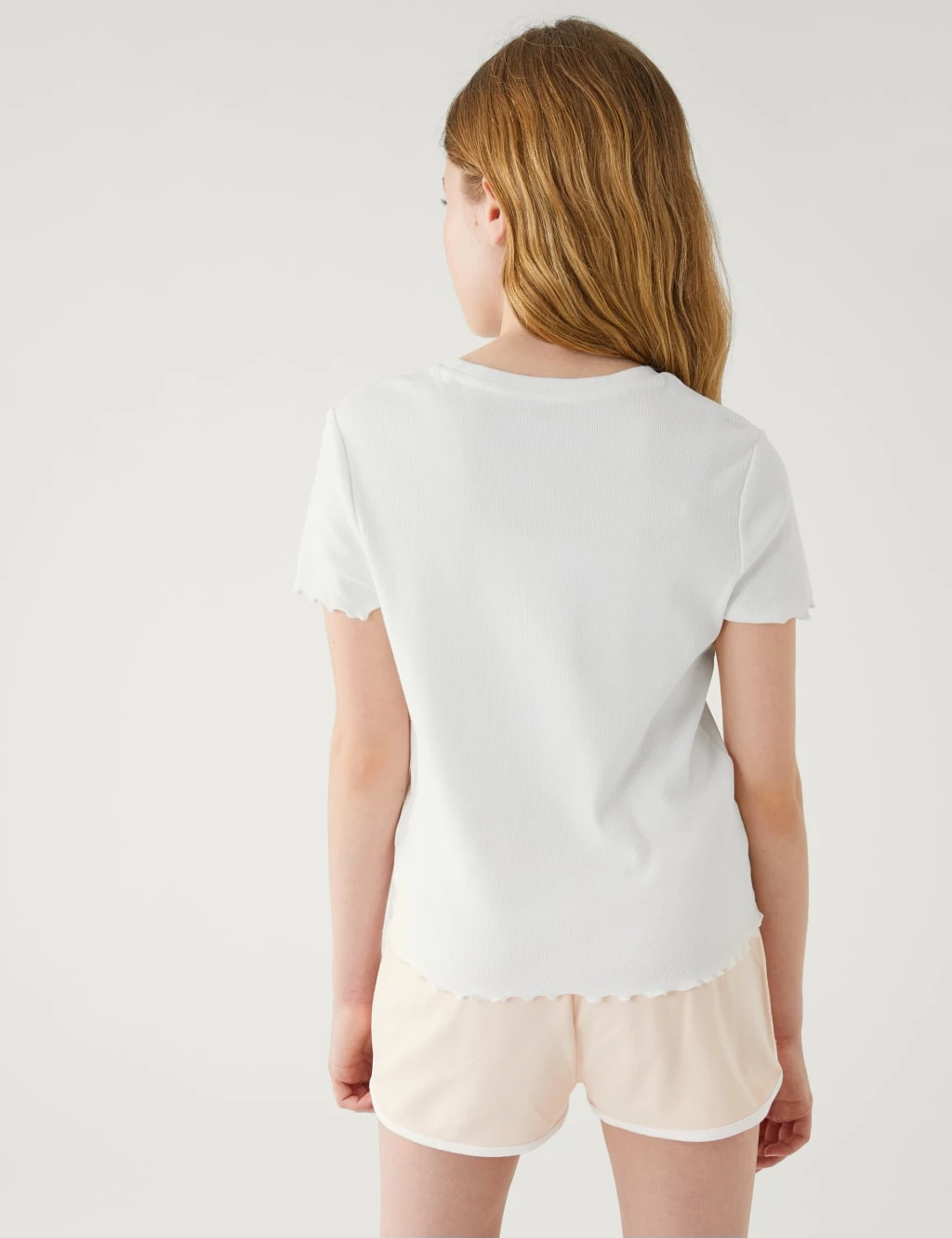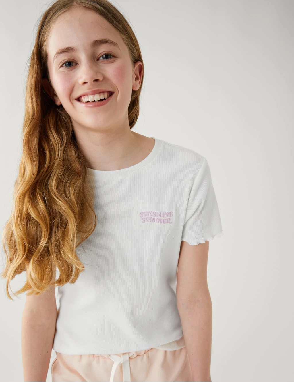 Let them have their time to shine in this cute ribbed cotton-rich t-shirt. Comfy regular fit. The short sleeves feature pretty lettuce hems while the chest is decorated with an embroidered ‘Sunshine Summer’ slogan.