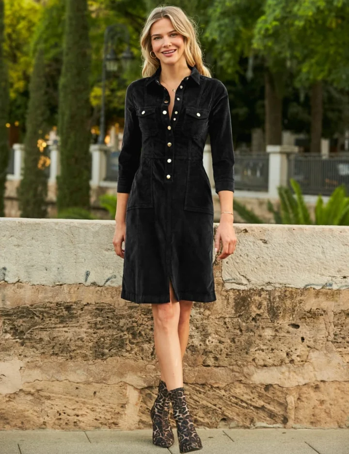 Crafted from sumptuous cotton-rich velvet, this skater dress by Sosandar feels as good as it looks. It comes in a flattering fit-and-flare shape that falls to an elegant midi length. Seaming through the waist adds structure, while metal snap fastenings and chest pockets deliver an authentic look. It’s complete with two side pockets for your essentials and neat 3/4-length sleeves with buttoned cuffs.