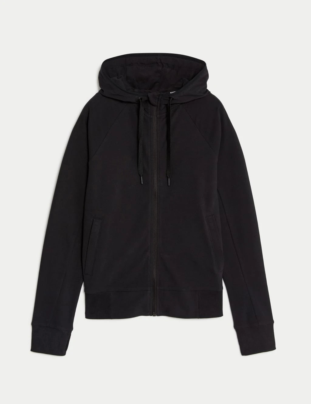 This super-soft hoodie from our Goodmove collection is made from a breathable cotton-rich fabric that’ll keep you comfy. Regular fit, with long sleeves and a warm hooded neck. We’ve added a touch of stretch for easy movement, plus thumbholes for cosy wear. Finished with a zip fastening and secure zip pockets, plus a subtle logo at the ribbed hem. We only ever use responsibly sourced cotton for our clothes.