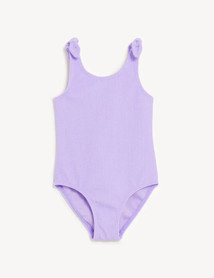 Kids can make a splash in this tie shoulder crinkle swimsuit. Comfy regular fit with added stretch to move with them as they swim. Chlorine-resistant fabric lasts longer. Sun Smart UPF50+ technology helps protect skin from harmful UV rays and is endorsed by the British Skin Foundation.