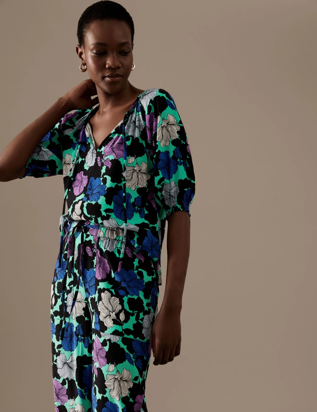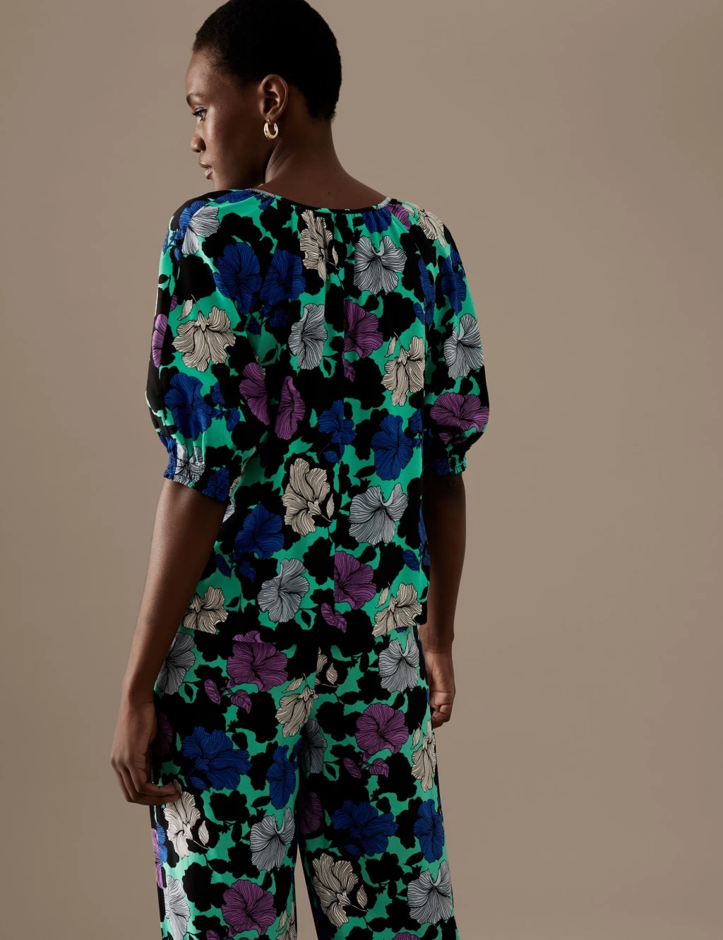 This printed blouse from our Autograph collection is crafted from cupro-rich fabric, giving a sheer and drapey finish. It’s cut to a regular fit, while gathers at the neckline and shoulders create a looser feel. The full puff sleeves end in pretty shirred cuffs. A tie at the neckline adds a delicate finishing touch. Autograph: premium investment pieces featuring contemporary cuts and refined finishing touches.