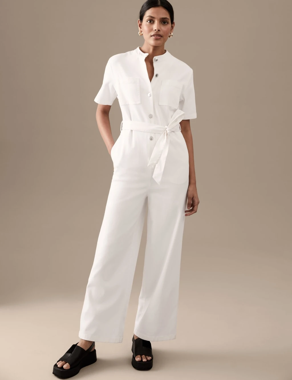 Crafted from Italian denim, this jumpsuit from our Autograph collection is the epitome of easy elegance. The high-necked style is cut in a comfy regular fit, with a self-tie belt accentuating the waist. Added stretch in the cotton-rich fabric gives a flexible feel. Patch pockets and large silver buttons add a utility-style edge to the short-sleeved piece.