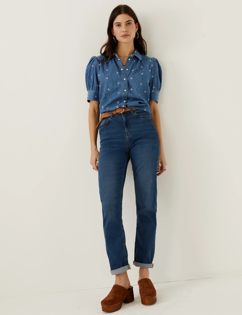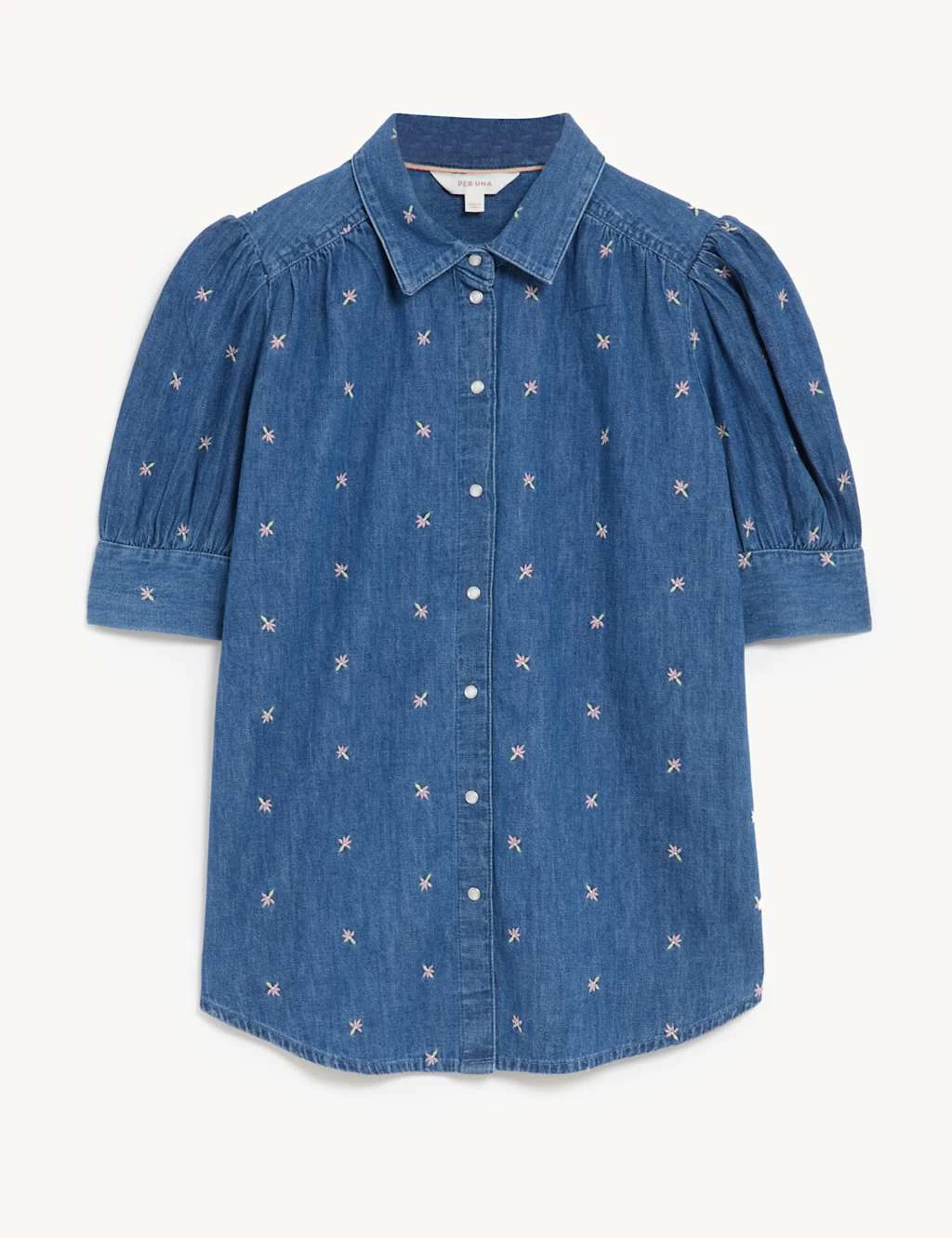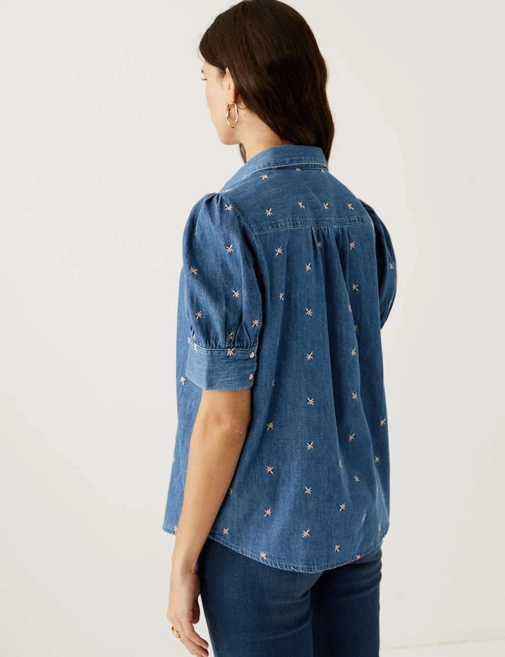 Embroidered details bring boho charm to this denim blouse from our Per Una collection. It’s cut to a comfortable regular fit, with gathers at the shoulders and back yoke for a looser feel. The short puff sleeves finish in wide buttoned cuffs. This piece fastens with a row of contrasting buttons, which run from the smart collared neckline to the gently curved hem.