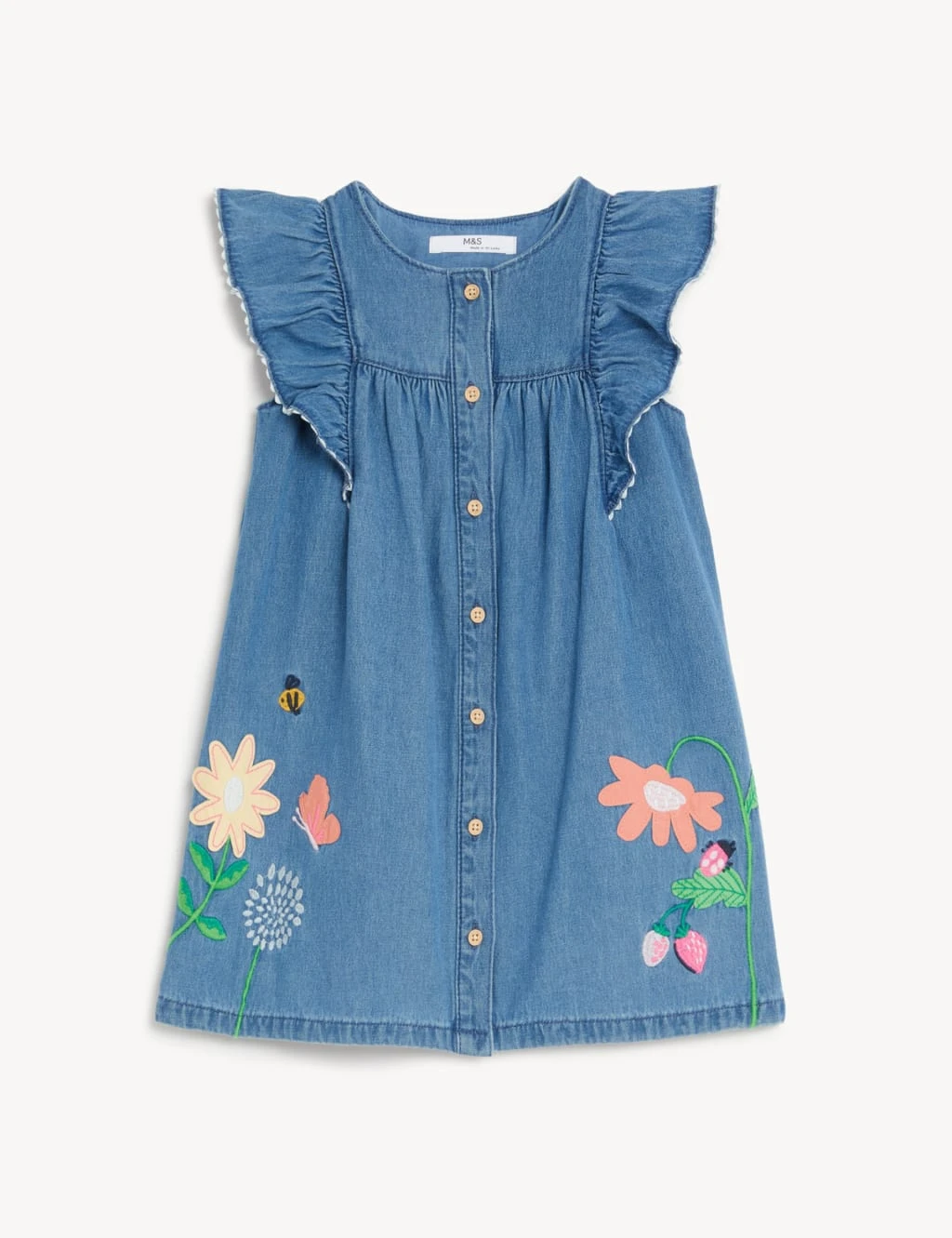 This denim dress is full of charming details, from its frilly shoulders to the tiny embroidered bee. Cut in a comfortable regular fit, with a button-through front. There are cute little bugs among the embroidered flowers.