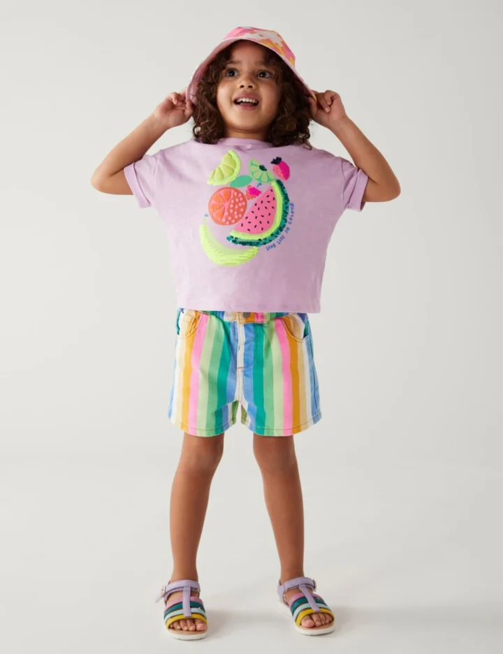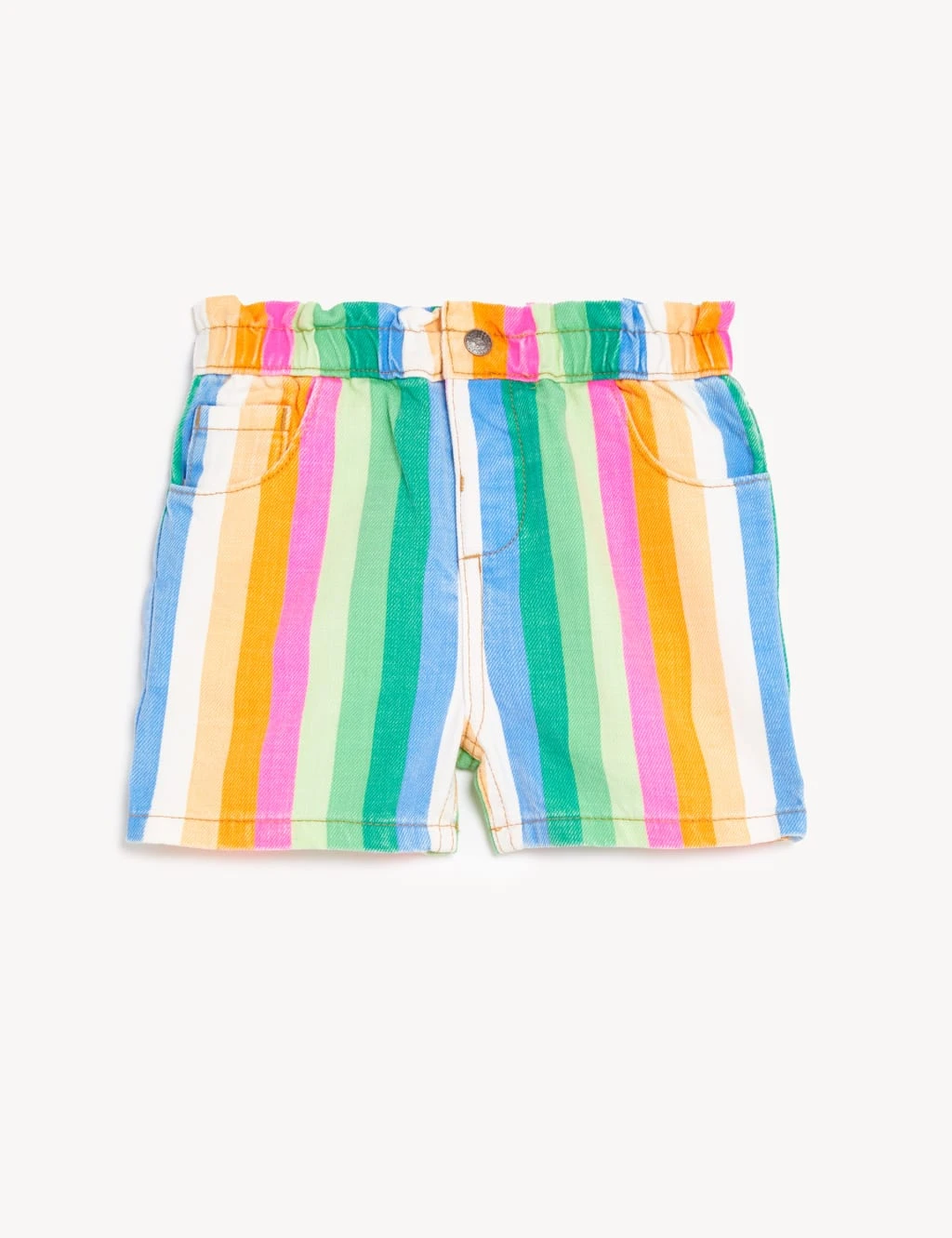 These rainbow-striped denim shorts are bound to become a favourite for sunny days. Comfy regular-fit style with an elasticated waistband for the perfect fit. Complete with front pockets and a button and zip fastening.