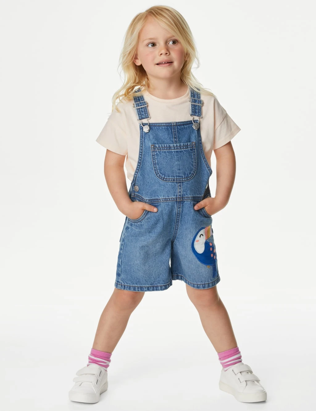 Make summer dressing simple with this pure cotton dungaree and t-shirt outfit. Comfy regular fit. Adjustable shoulder straps can be lengthened as your child grows. Clasp fastening for fuss-free dressing. The denim short-leg dungarees feature pockets, shiny buttons and a colourful toucan appliqué.