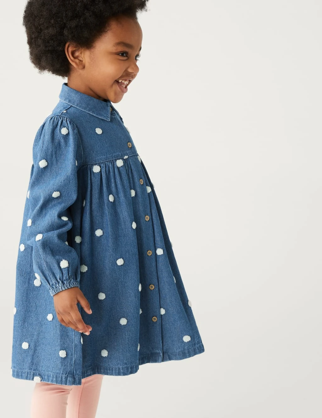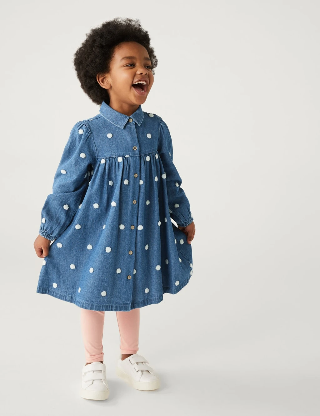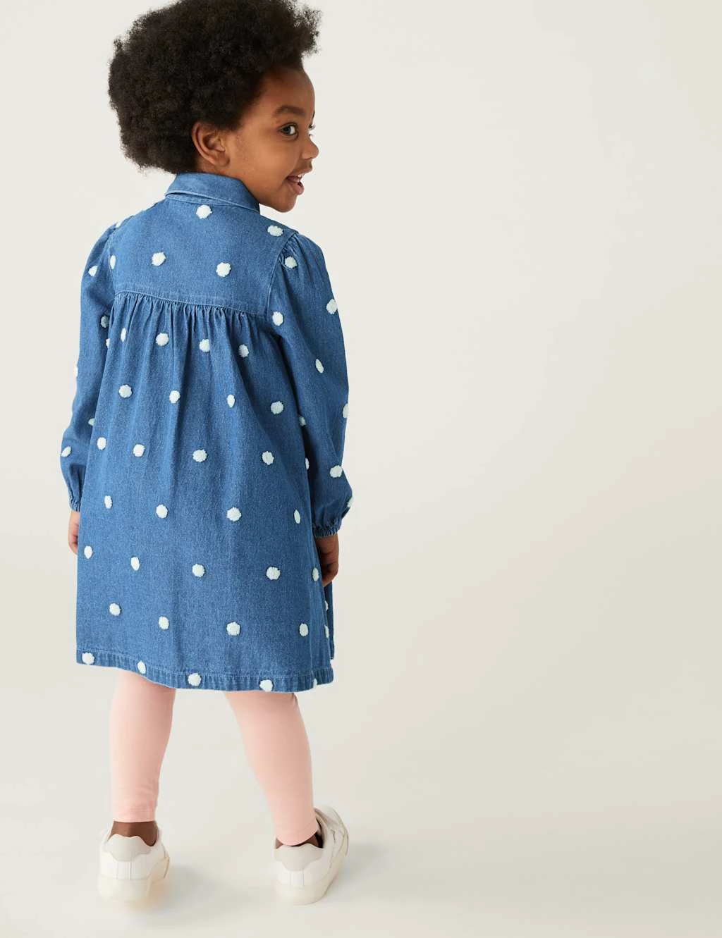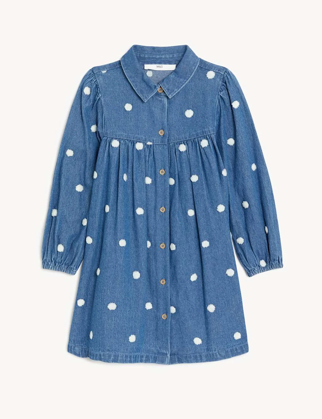 This pure cotton denim dress is a picture-perfect piece. It’s cut to a regular fit, with long sleeves, a full gathered skirt and buttons down the front. Eye-catching embroidered dots and a neat collar complete the pretty design.