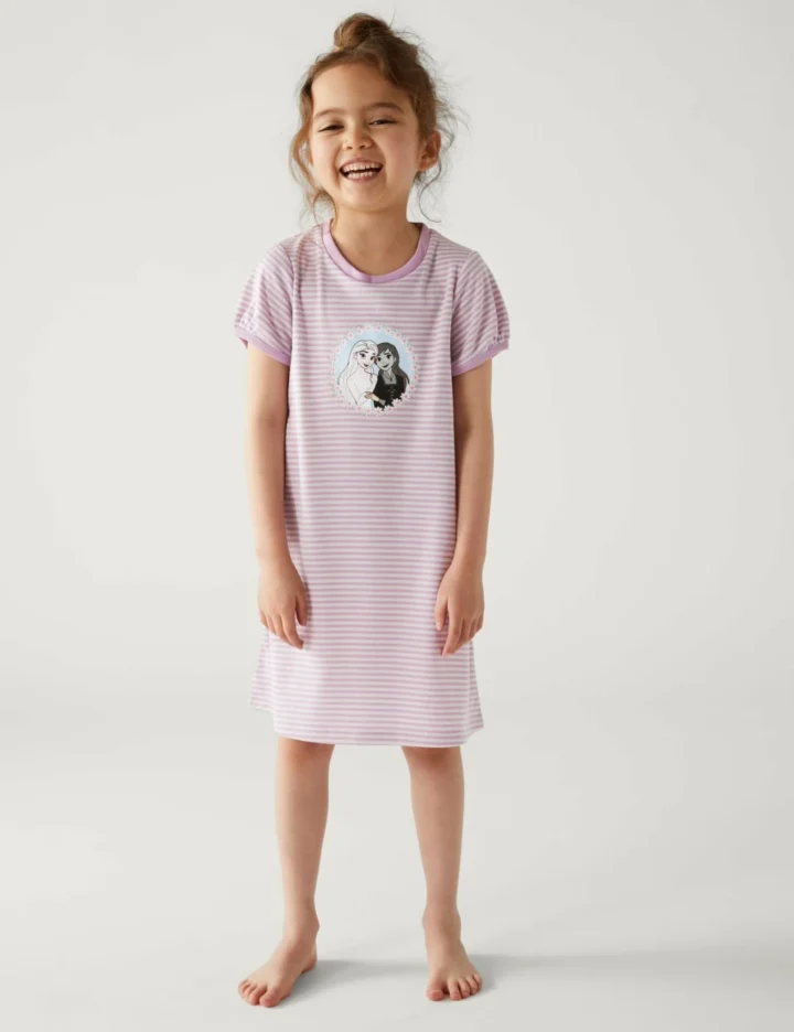 Disney Frozen™ fans will love bedtime with this classic nightdress. Comfy regular fit, with short sleeves to help keep them cool. Striped design, featuring a central graphic of Anna and Elsa surrounded by pretty flowers.