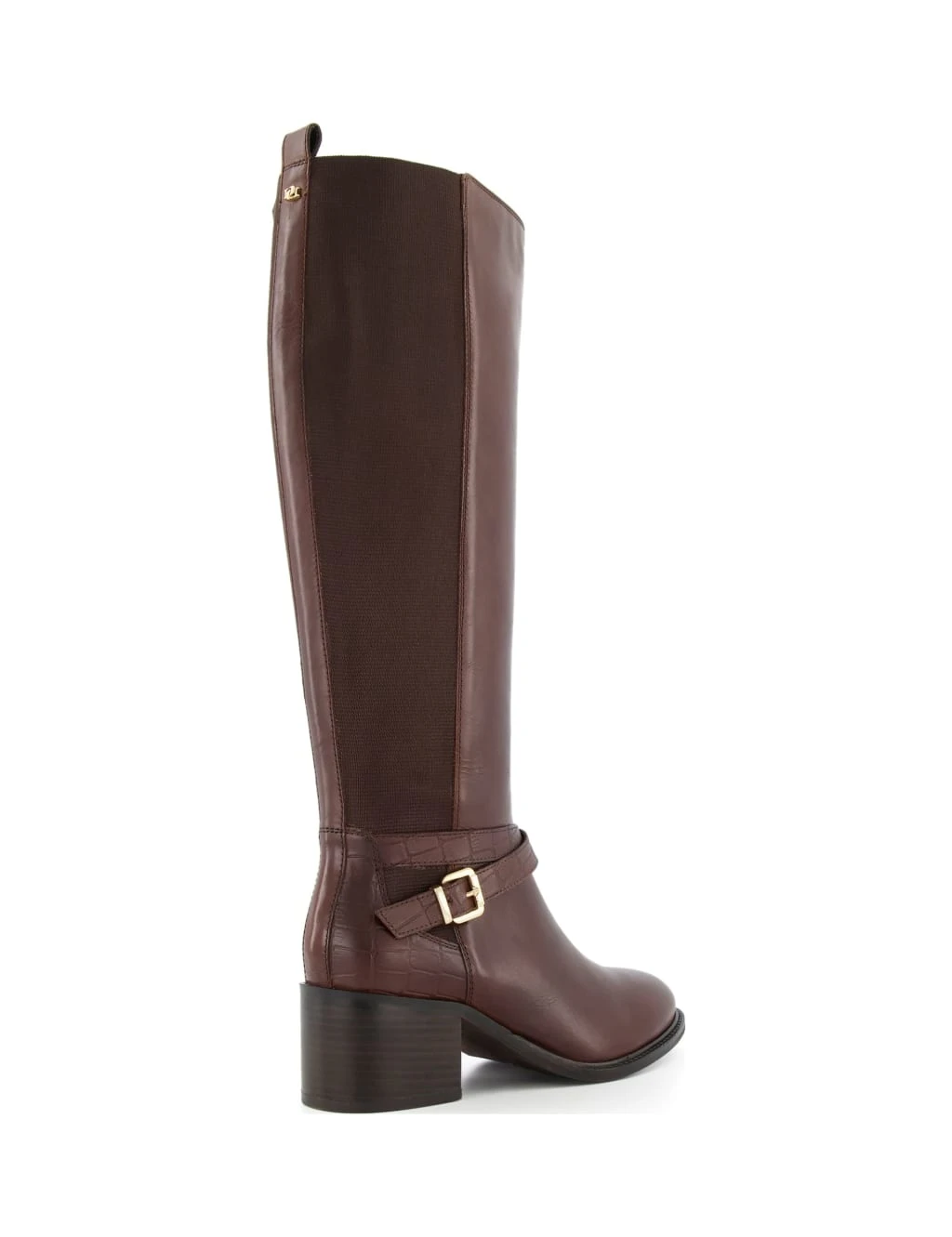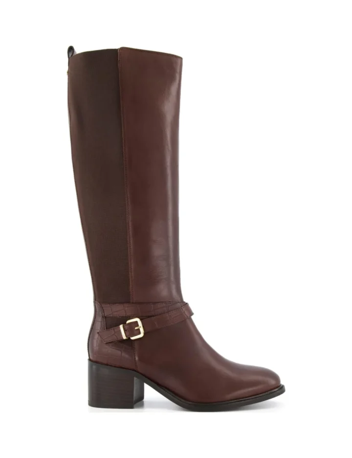 Add a classic look to your footwear collection with these leather boots from Dune. This knee-high design features a comfortable mid-height block heel. An elastic panel down the side helps you to pull them on with ease, and the boots fasten with a discreet side zip. The mock croc strap and gold-tone buckle detail across the ankle provide sophisticated detail.