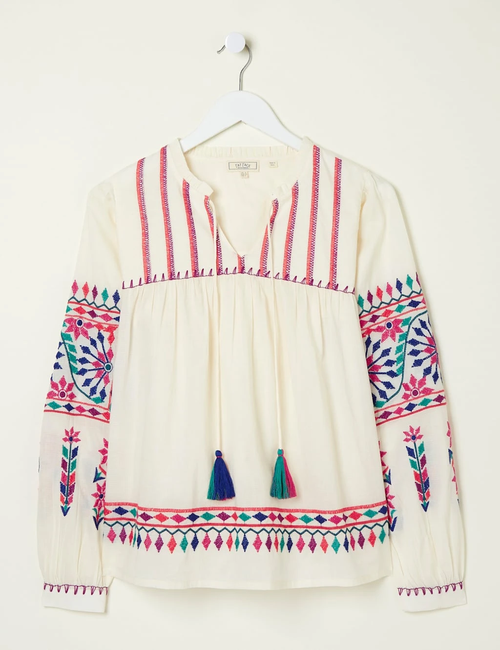 The vibrant embroidery on the yoke, hem and sleeves makes this blouse by FatFace a real standout piece. It’s cut in a comfortable regular fit, with gathers at the chest for a looser feel. The ties on the frilled v-neck finish in multicolour tassels, adding an extra pop of detail.