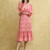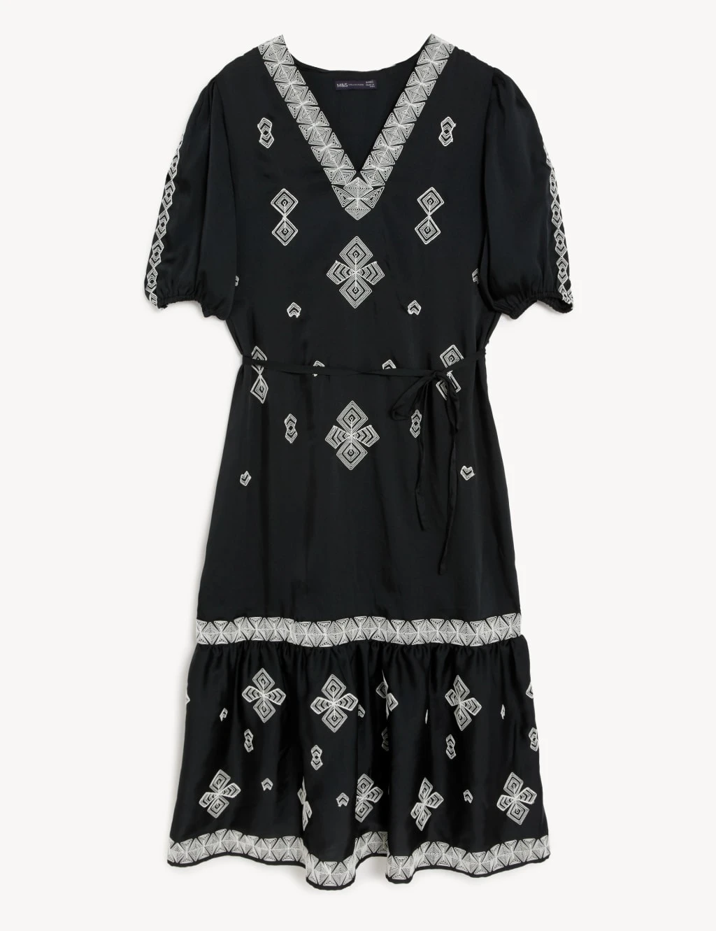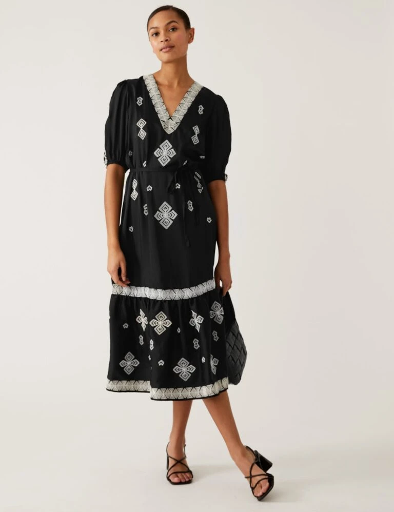 This tiered dress is stitched with contrasting embroidery for a stand-out look. It’s crafted in a relaxed fit for a laid-back effect, with breezy half-length sleeves. A v-neck and midi hem create a flattering, feminine shape.