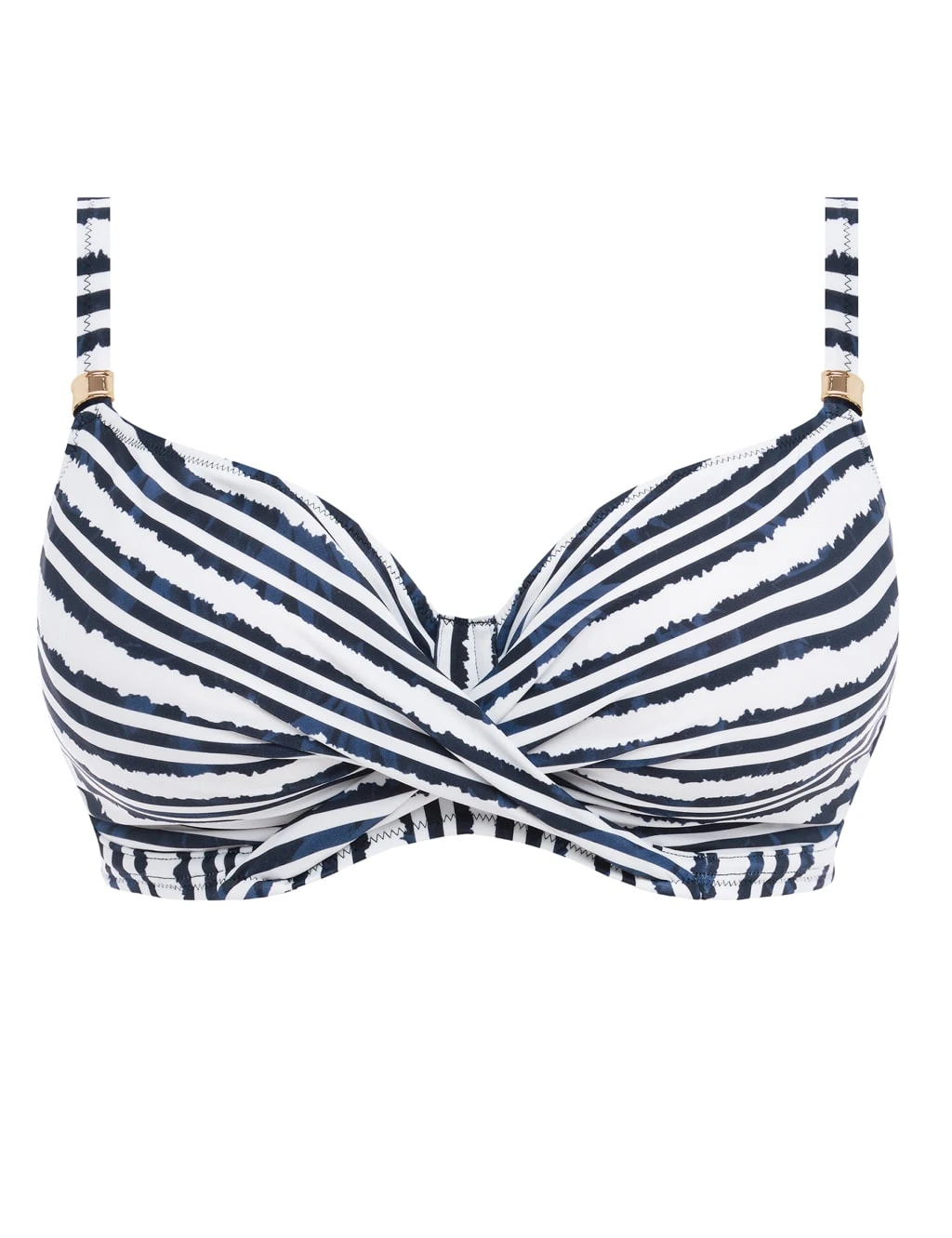 Bring style and comfort to the poolside with this nautical-inspired striped bikini top from Fantasie. This underwired, full-cup design features a concealed side sling and powernet lined wings to provide support and create a naturally rounded shape. Wrap-over detail on the front adds to the flattering silhouette, while non-padded cups ensure a lightweight feel. Adjustable straps help you find the perfect fit. A sophisticated scoop back and discreet clasp fastening complete the design.