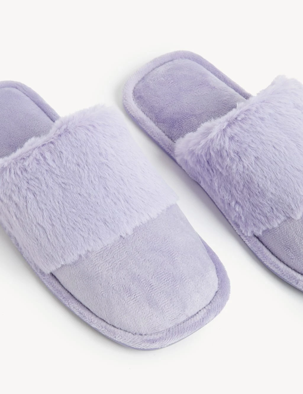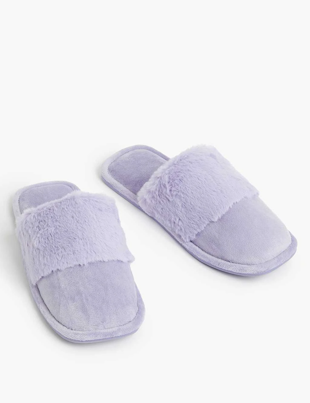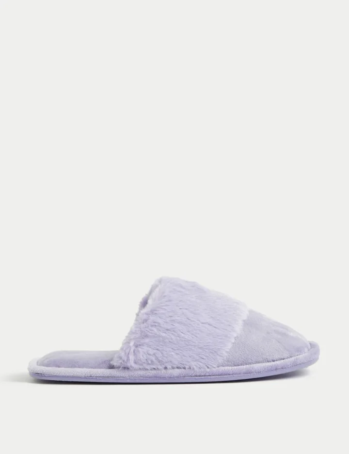 A cosy faux fur cuff makes these mule slippers a treat for your feet. Slip-on style for easy lounging.