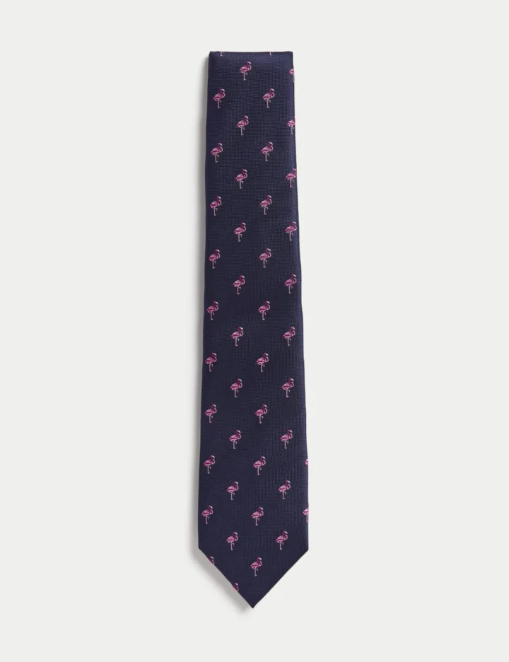 A colourful flamingo print lends a modern edge to this luxurious pure silk tie. Regular width for a classic look. Perfect for adding a bold touch to your occasion and workwear.