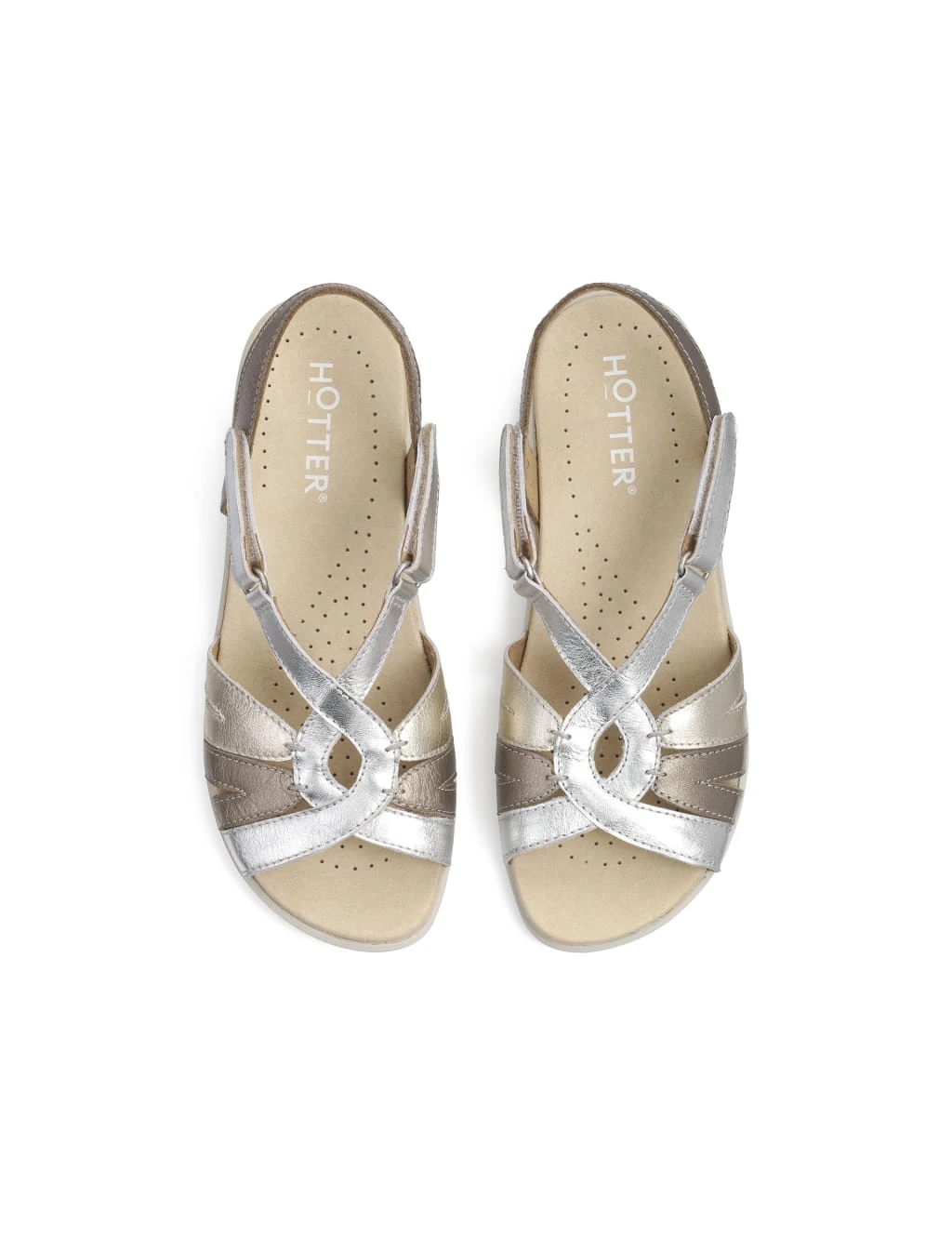 Choose maximum comfort during the warmer months with these leather strappy sandals from Hotter. They feature a supportive flatform heel and adjustable straps with riptape fastenings for easy on and off. The durable rubber sole offers a firm grip, while the soft padded insole provides a cushioned feel. Metallic detailing on the straps adds a shimmering finishing touch.