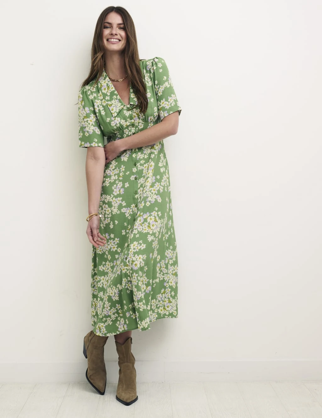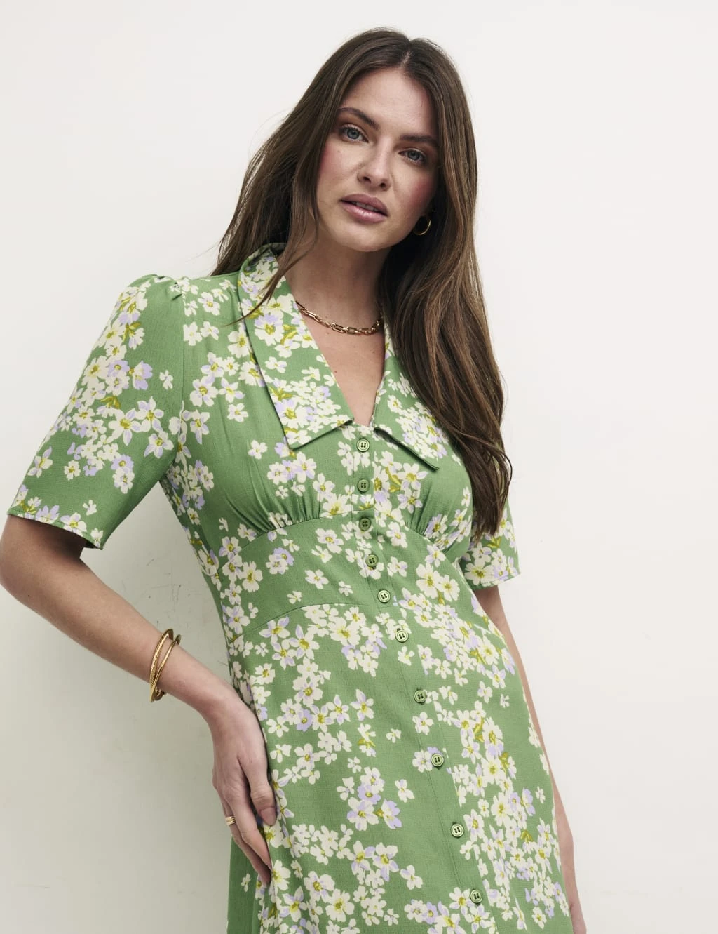 Scattered with pretty florals, this midi-length tea dress from Nobody’s Child is full of feminine charm. The regular-fit piece has an on-trend collared neck and a flattering empire waist. It’s designed with short sleeves for a breezy feel and a smart button-through fastening.