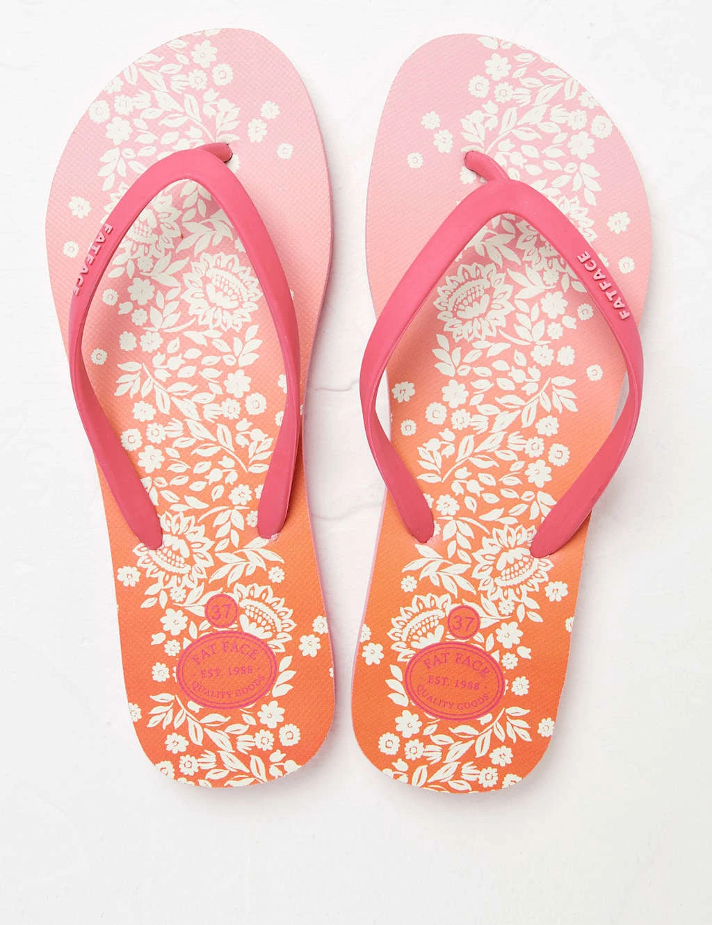 Add these FatFace ombre flip flops to your summer essentials for a fun pop of colour. They feature a classic toe-post design and a flat sole for comfort. Florals are printed onto the footbed for a pretty finish.