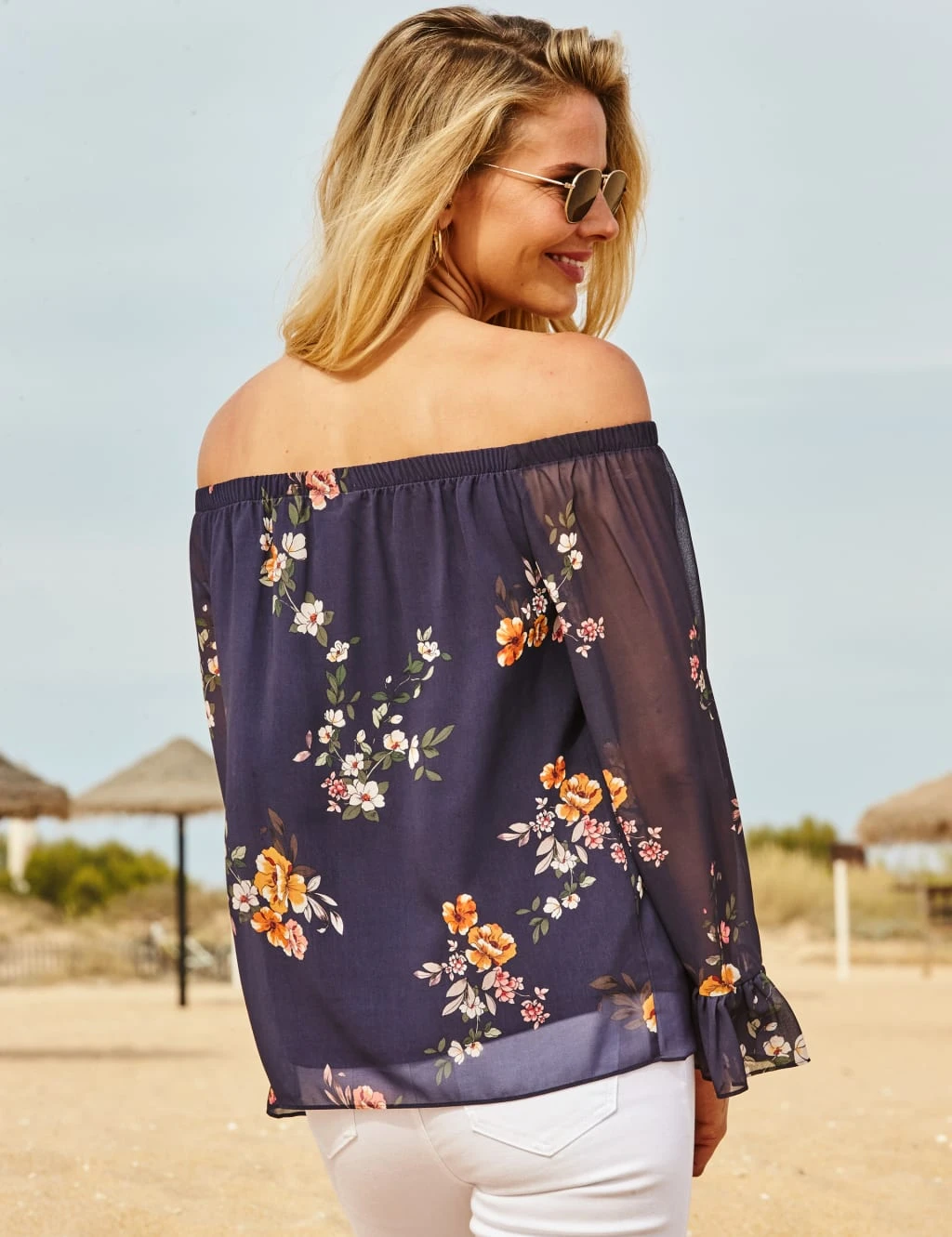 With its feminine floral print and semi-sheer sleeves, this Bardot blouse from Sosandar is sure to turn heads. It’s cut in a flattering regular fit and sits off the shoulder for sunshine-ready style. The topline is elasticated for a comfortable feel, and frilled cuffs add an extra romantic touch.