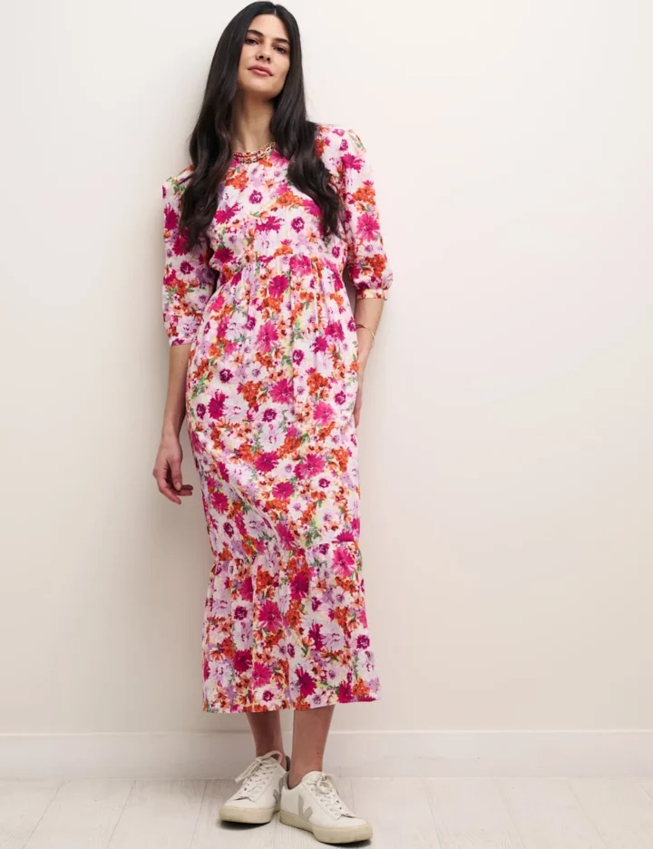 For a light and floaty feel, try this pretty floral tea dress from Nobody’s Child. It’s cut in a relaxed fit from drapey fabric that falls to a flattering midi length. The slightly full, three-quarter sleeves finish in neat cuffs, while the understated crew neck curves around into a keyhole detail at the back, with a single button fastening.